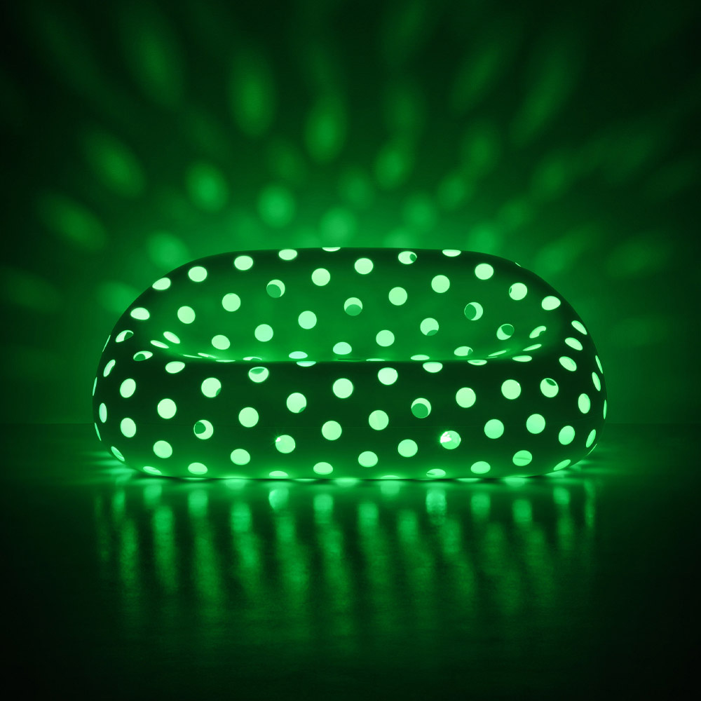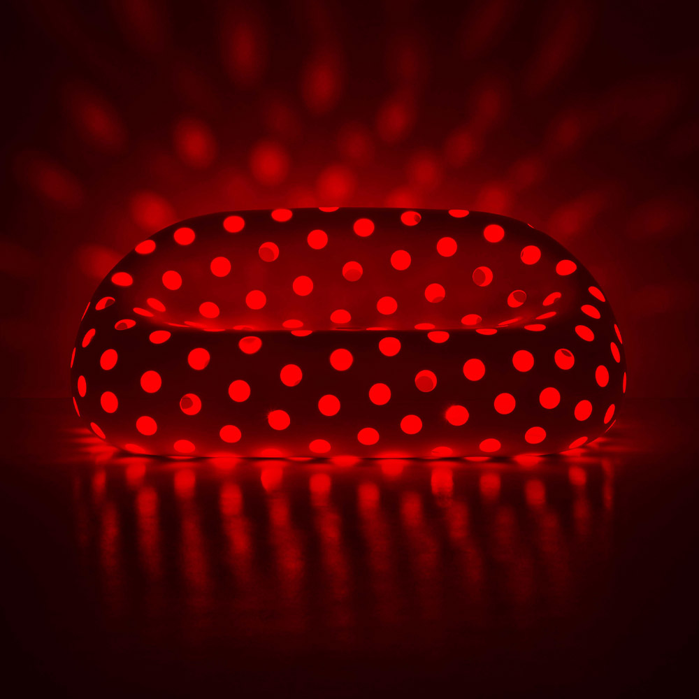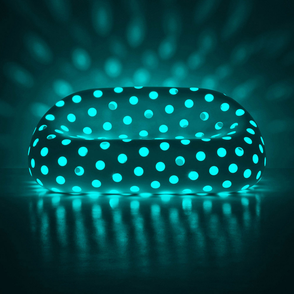 Zahradní sedací souprava vyrobená v Itálii v neprůhledném bílém polyetylenu s barevnou sadou RGB LED světel pro venkovní použití. Originální nápad na nábytek, jehož postavu charakterizují pohodlné a moderní linie, které spolu s LED osvětlením umožňují dokonalé spojení funkčnosti a designu . Díky své matné povrchové úpravě je obzvláště odolný vůči slunci, nárazům a teplu, stejně jako extrémně elegantní a s vytříbenou estetikou. Unikátní a inovativní design, který zdůrazňuje tvary, má skvělý scénický dopad a je ideální pro venkovní prostředí, která vyžadují řešení nábytku se silnou osobností. Perforovaný povrch dodává sedačce nebývalou lehkost a díky světelnému zdroji vloženému dovnitř vytváří velkolepé hry světla.