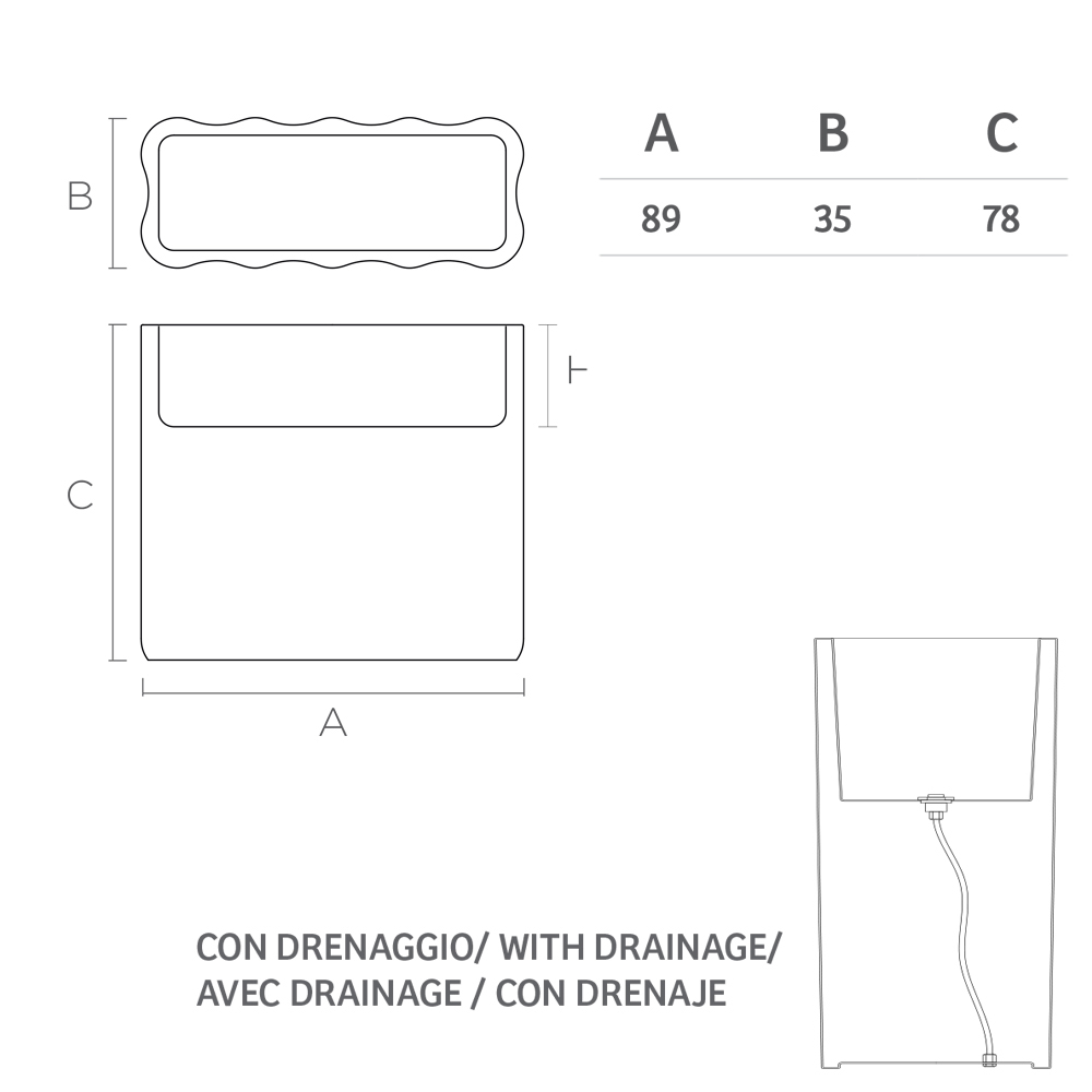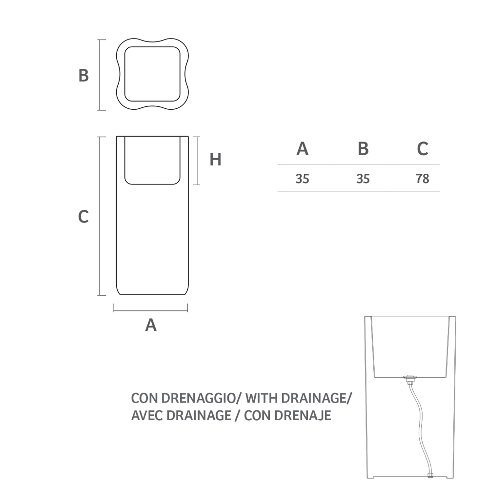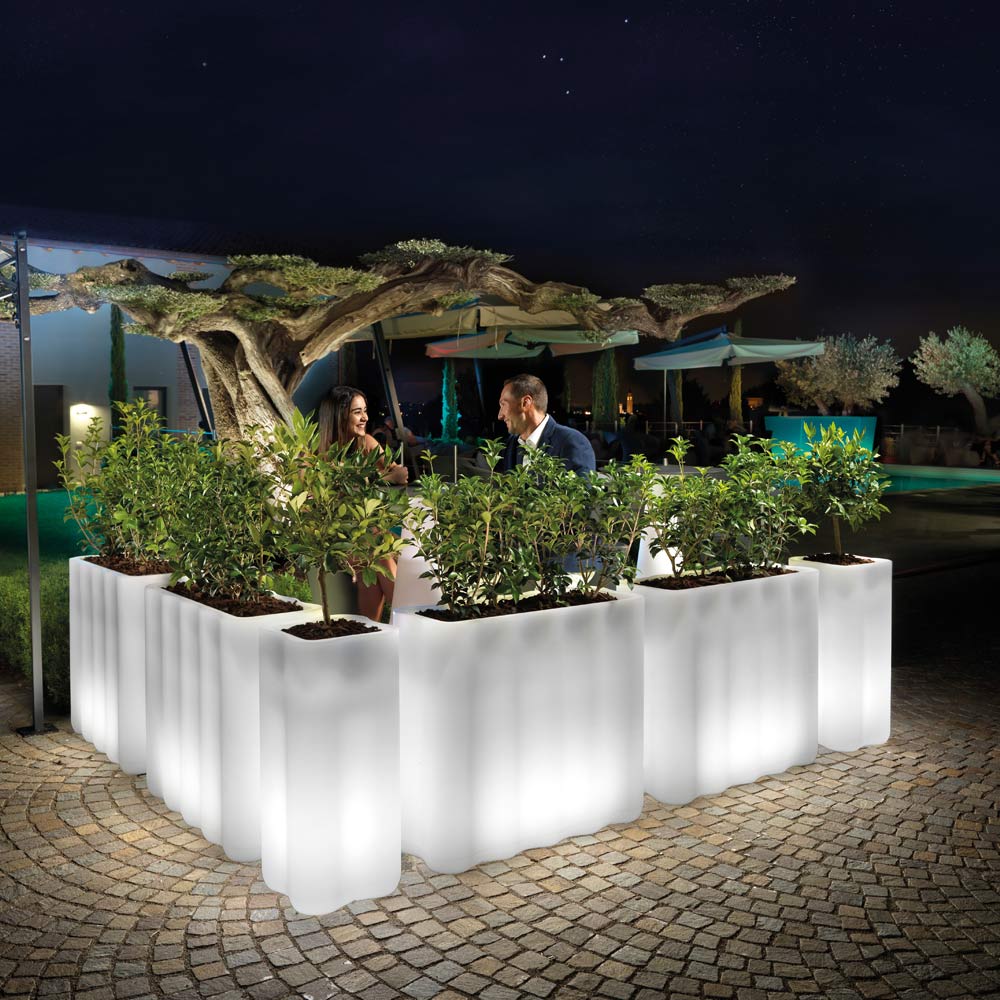 Svítící venkovní váza z perleťového polyetylenu vyrobená v Itálii . Integrované LED světlo promění tuto venkovní vázu na nábytkový doplněk s jemnými a klikatými liniemi, které odrážejí myšlenku klasického, ale neuvěřitelně elegantního stylu. Součástí konstrukce je také sada pro odvod vody pro maximální využití praktičnosti a funkčnosti tohoto produktu, aniž by byl zanedbán konečný výsledek, elegantní a sugestivní světelná atmosféra.