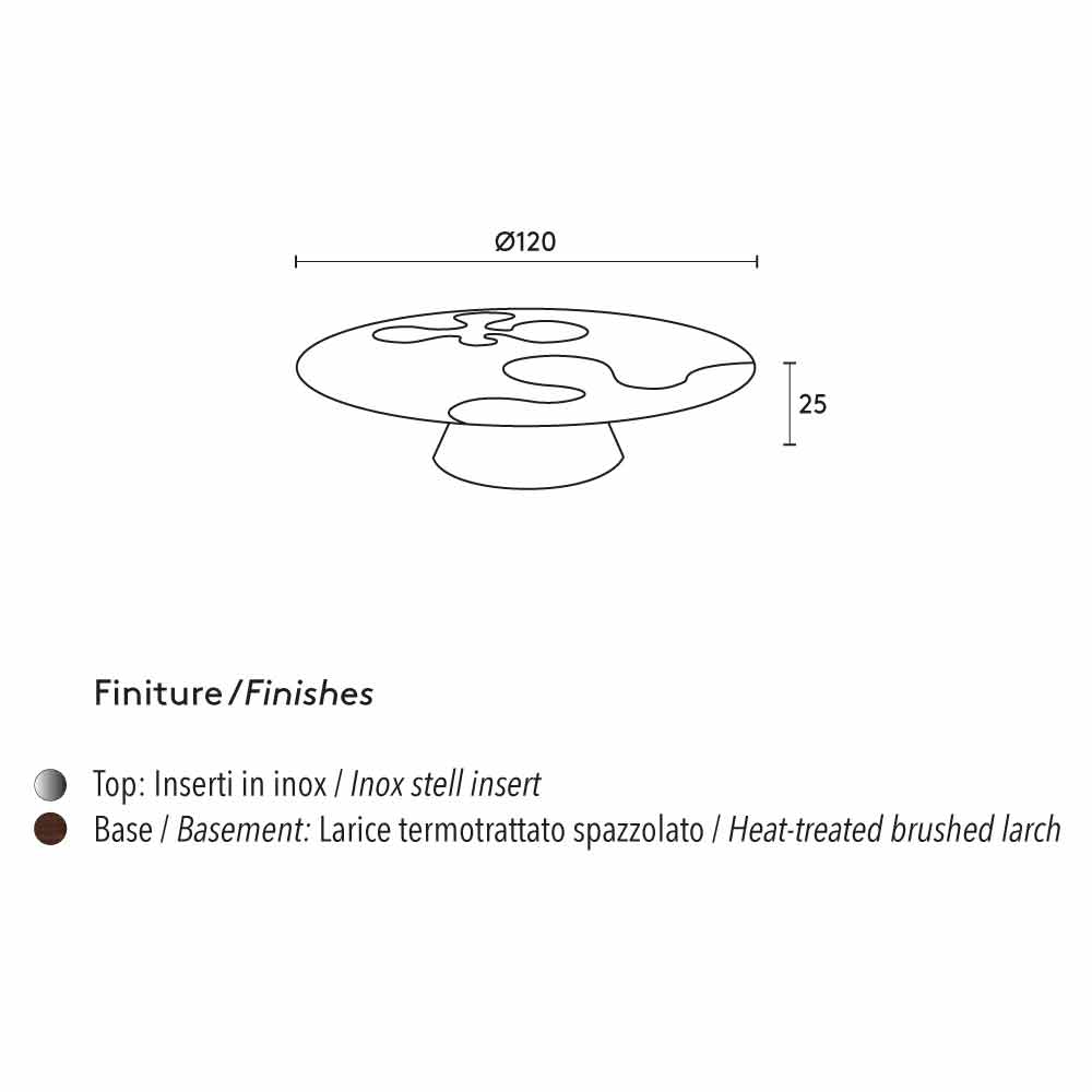 Konferenční stolek vyznačuje patro s vložkou z ušlechtilé oceli a vybrání. Kuželovou základnou kartáčovaného modřínu tepelně upravených.