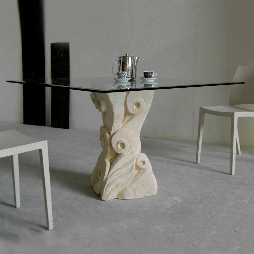 Tabulka Vyrobeno kompletně moderní čtvercový stravování v Itálii, s centrálním základny ve Vicenze přírodního kamene, vyřezával ručně z masivního bloku, s float skleněnou deskou o 15 mm, připevněných k základně odnímatelnou ocelovou přírubou.
