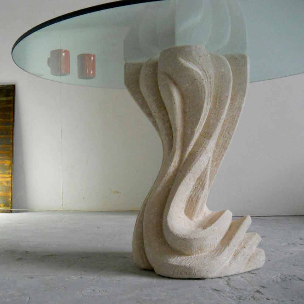 Tabulka moderní kolo stolování Vyrobeno v Itálii s centrální databáze v Vicenza přírodního kamene, tvarované ručně z pevného bloku a se skleněnou plovákem od 15 mm, připevněných k základně ocelové příruby.