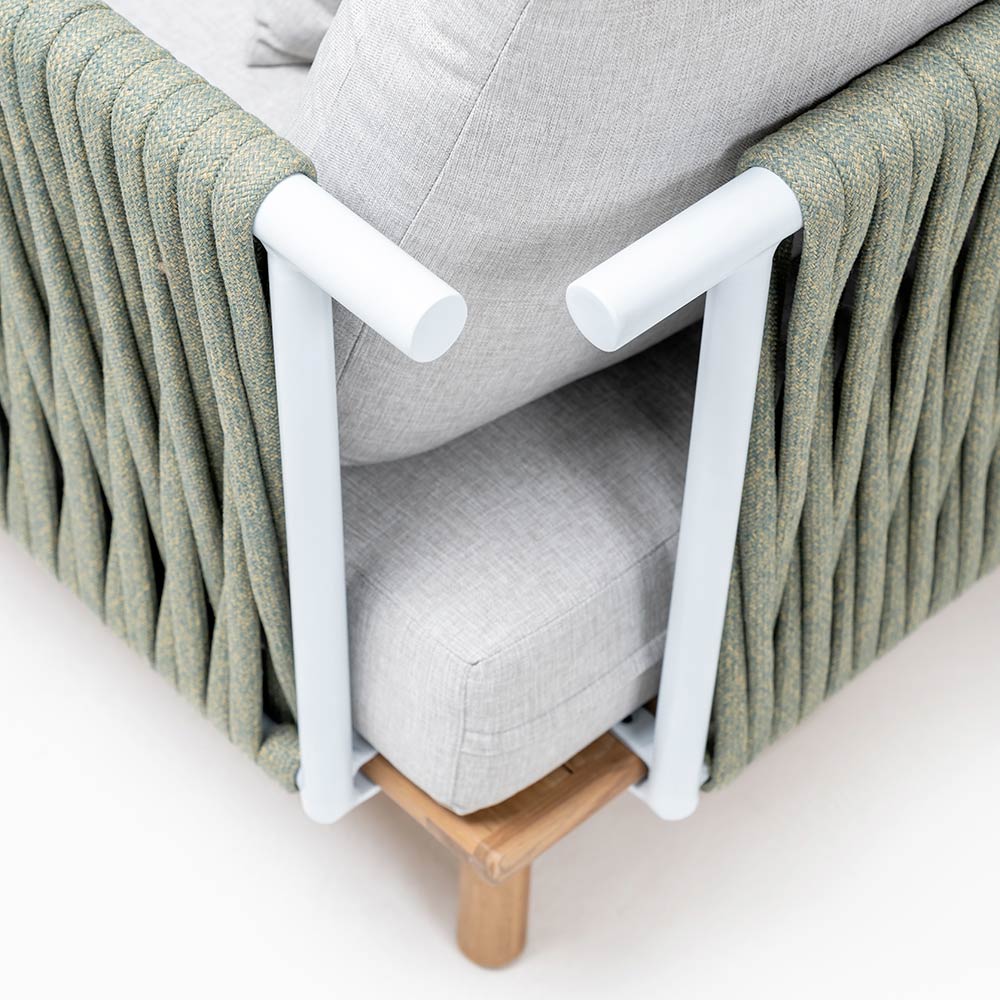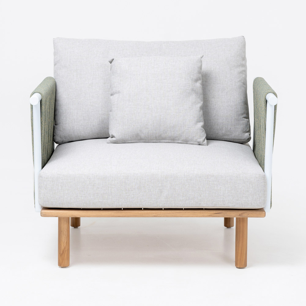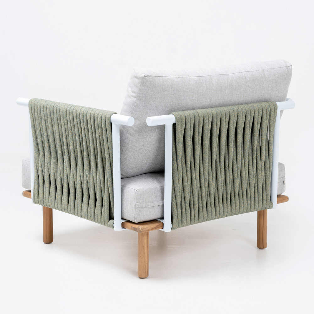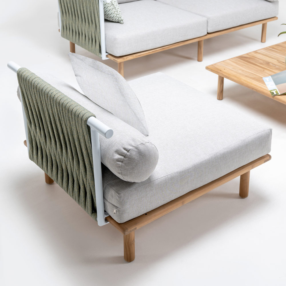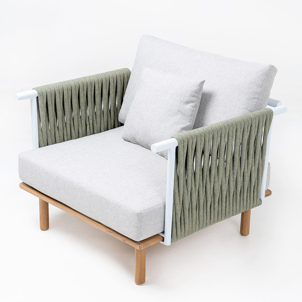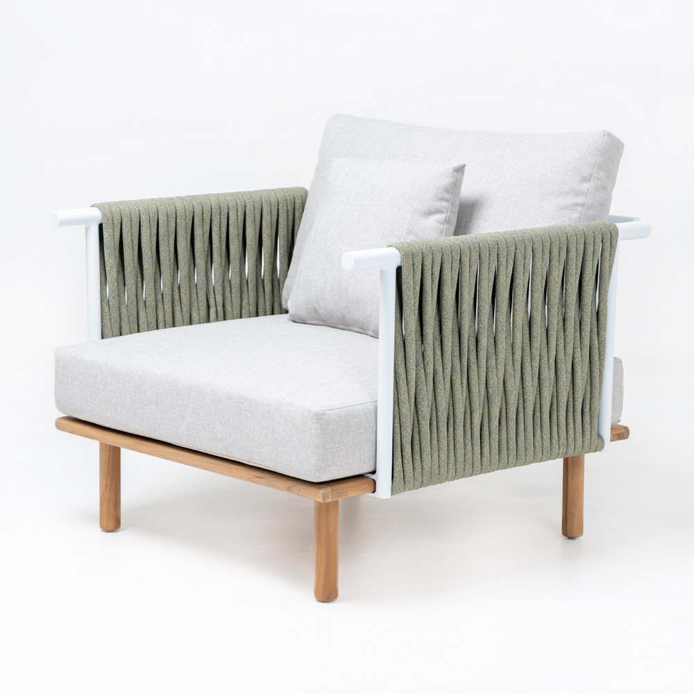 Dřevěné zahradní křeslo, hliníkové opěrky a výplet a polštář z materiálu Olefin/PP ROPE