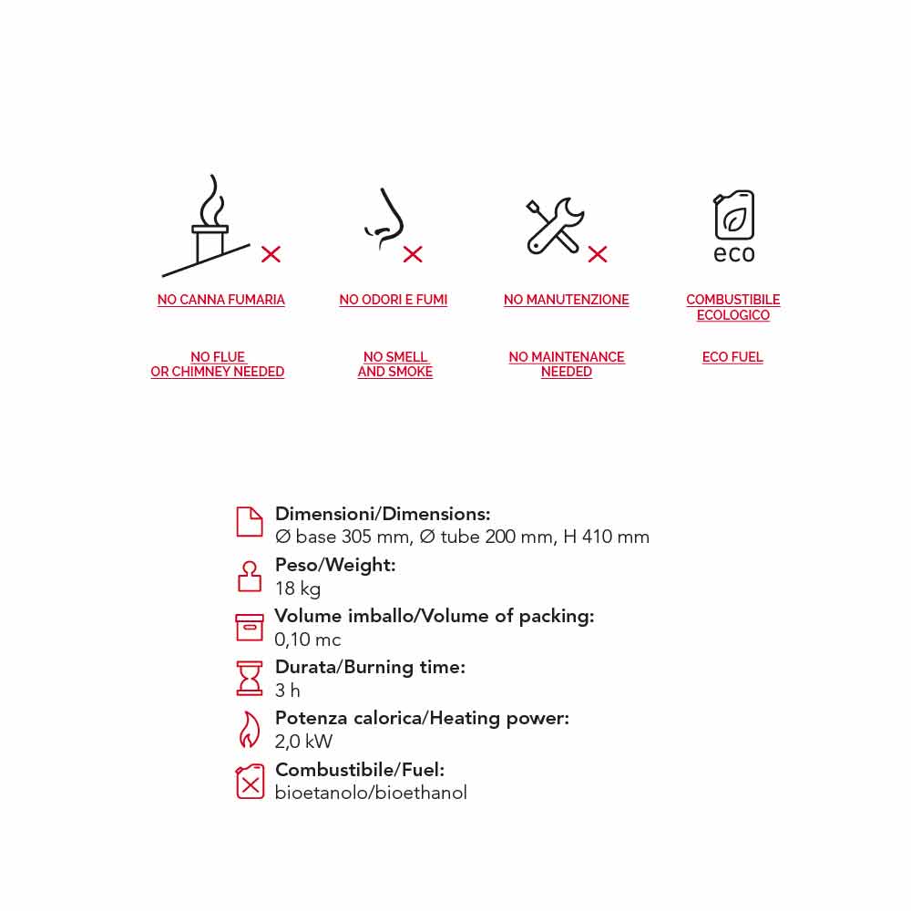 Hlavní Zvláštností tohoto krbu spočívá v jeho charakteristiky z neprodukuje dýmy a výpary, kromě nevyžaduje kouřovodu. Ekologické krb, který nepotřebuje údržbu, jak sytém bioetanolu, obnovitelný zdroj energie.