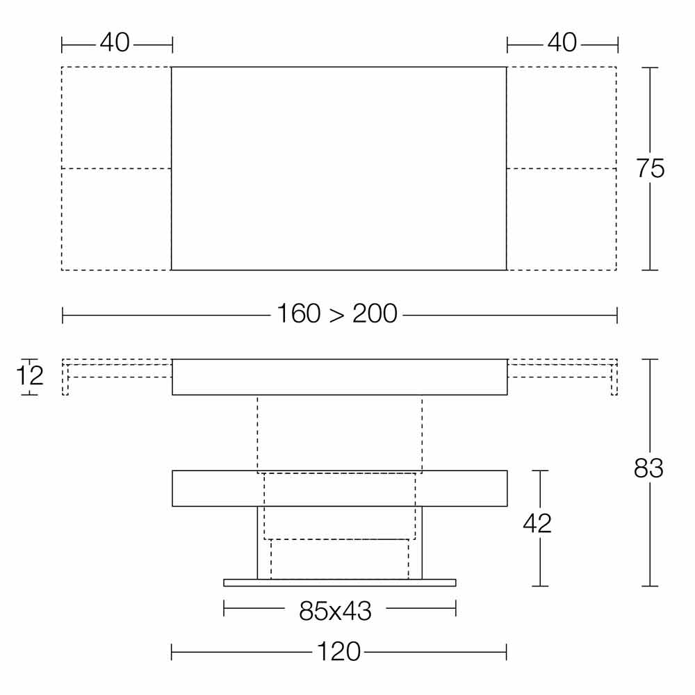 Horní část je rozšiřitelná pomocí dvou bočních prodlužovacích listů po 40 cm (vnitřní).