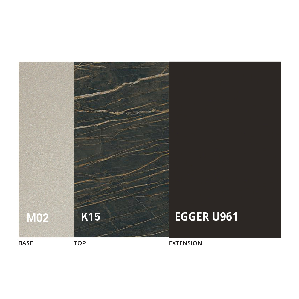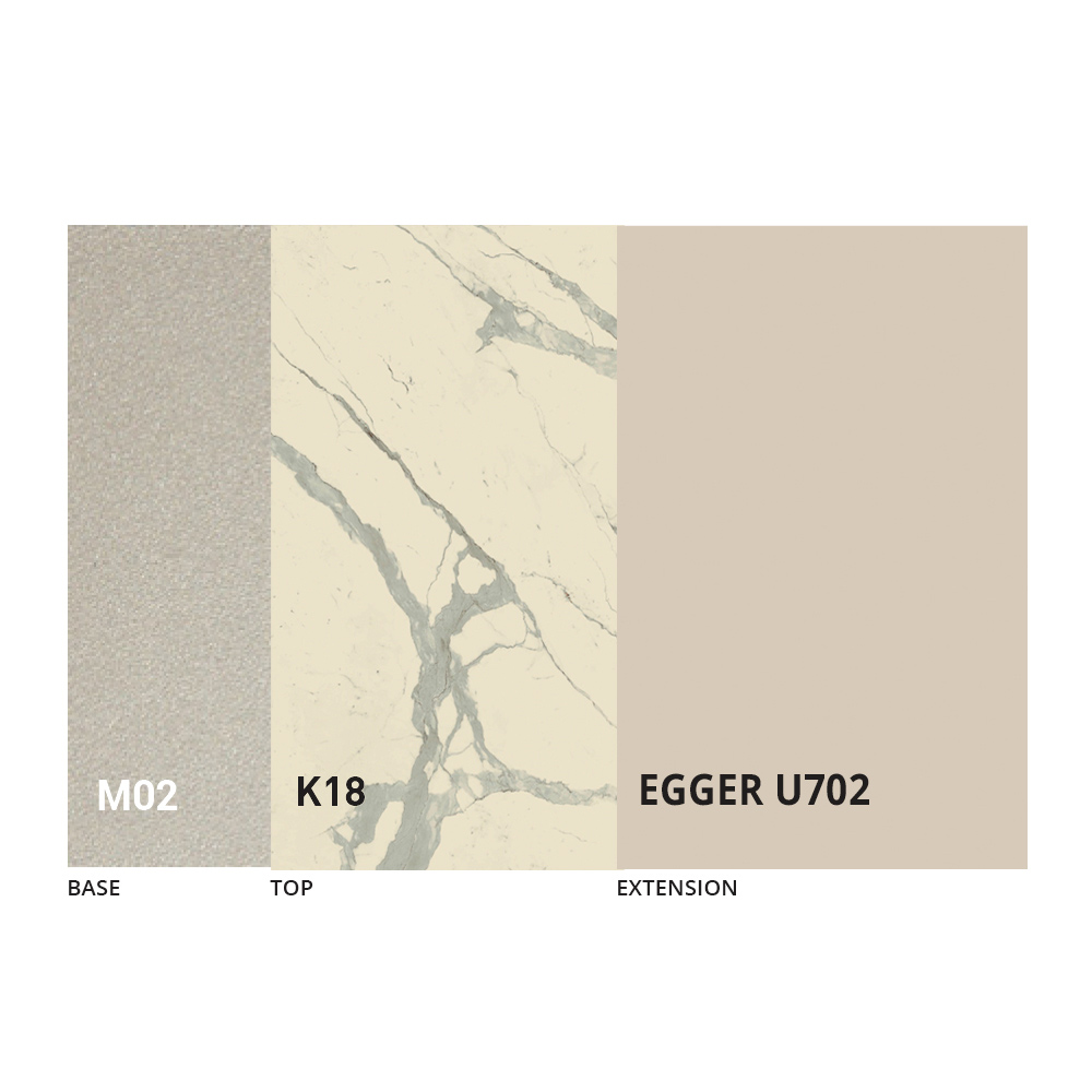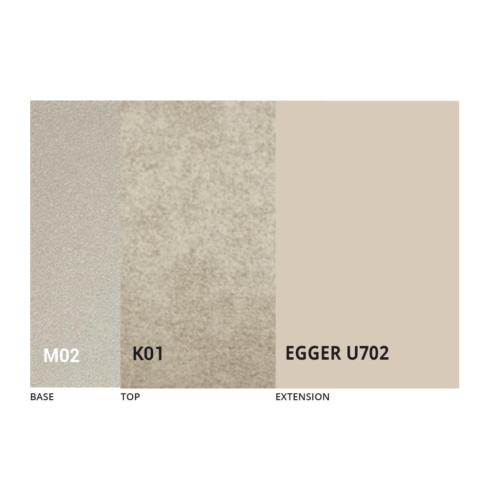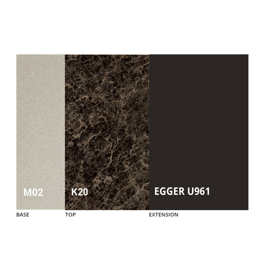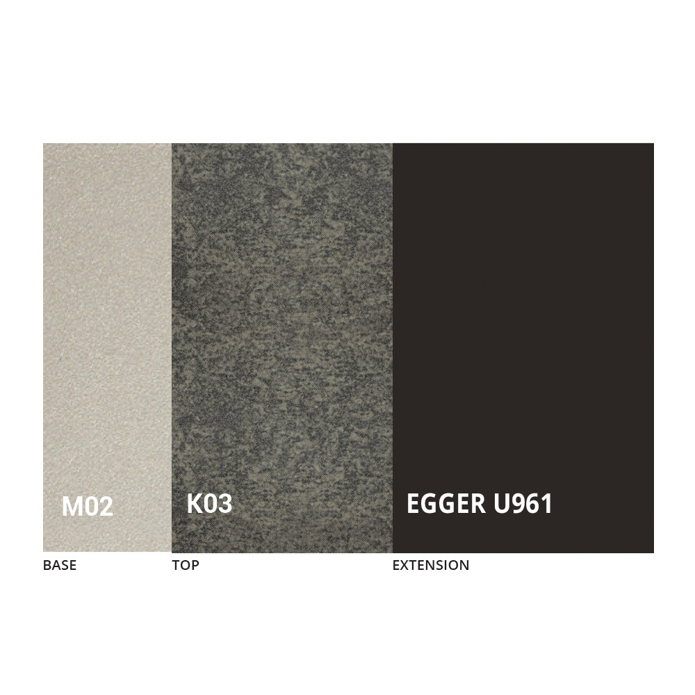 Vrchní deska je k dispozici v provedení melamin, matná keramika, sklo a maltový efekt v široké škále povrchových úprav.