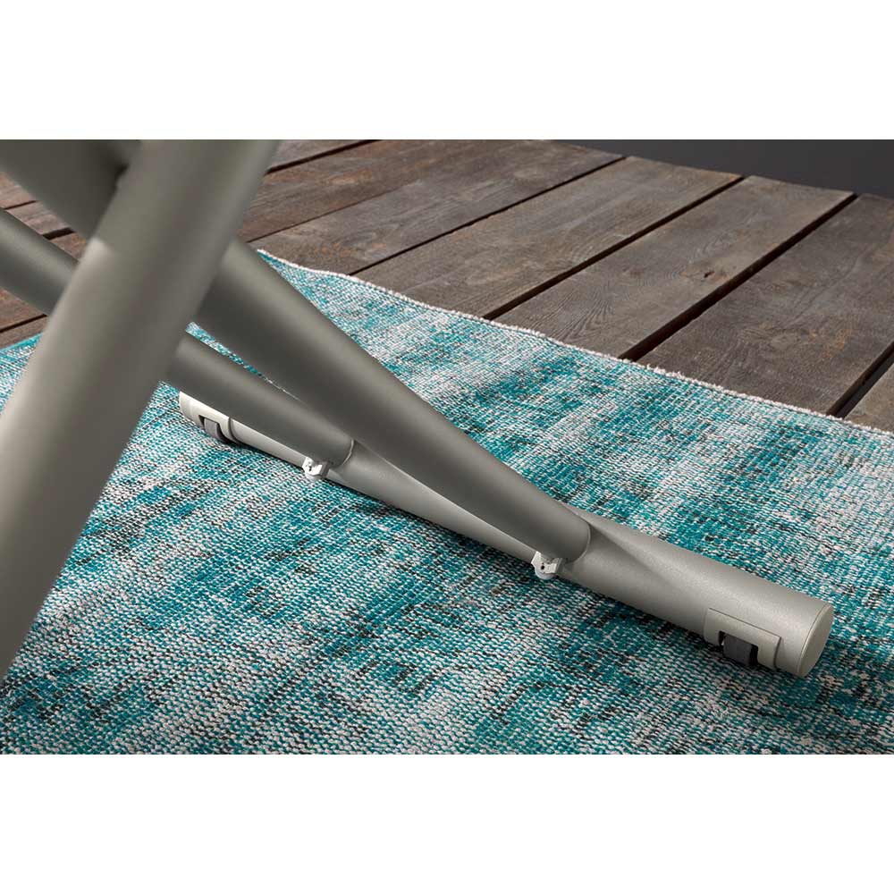reliéfního kovu lakovaného do žáru, doplněného příčnými zatahovacími kolečky. Tento kus nábytku, který se vyznačuje