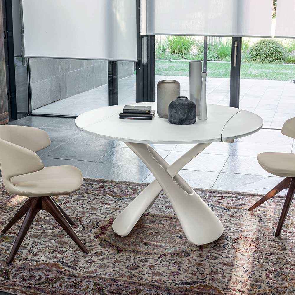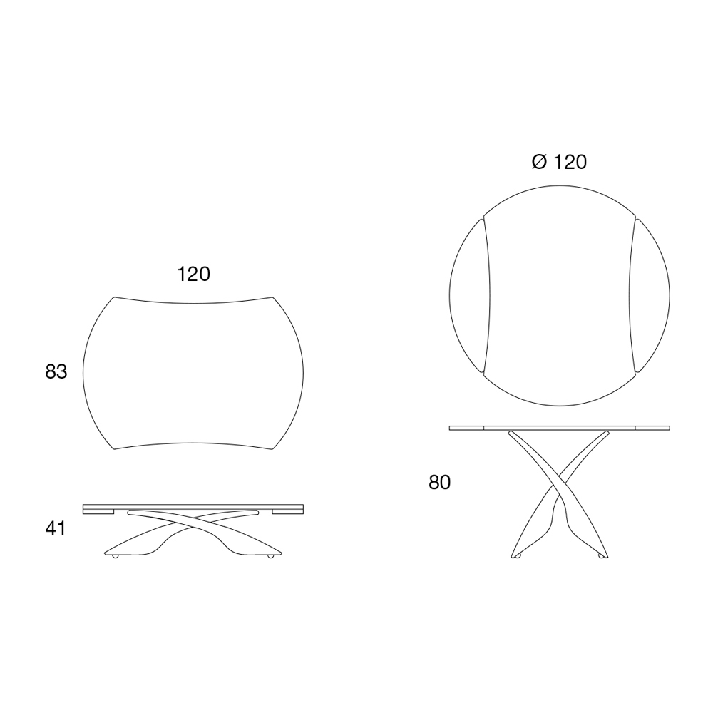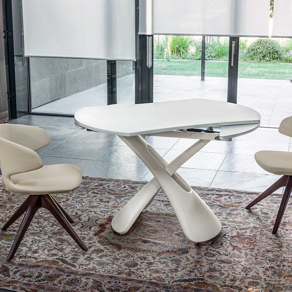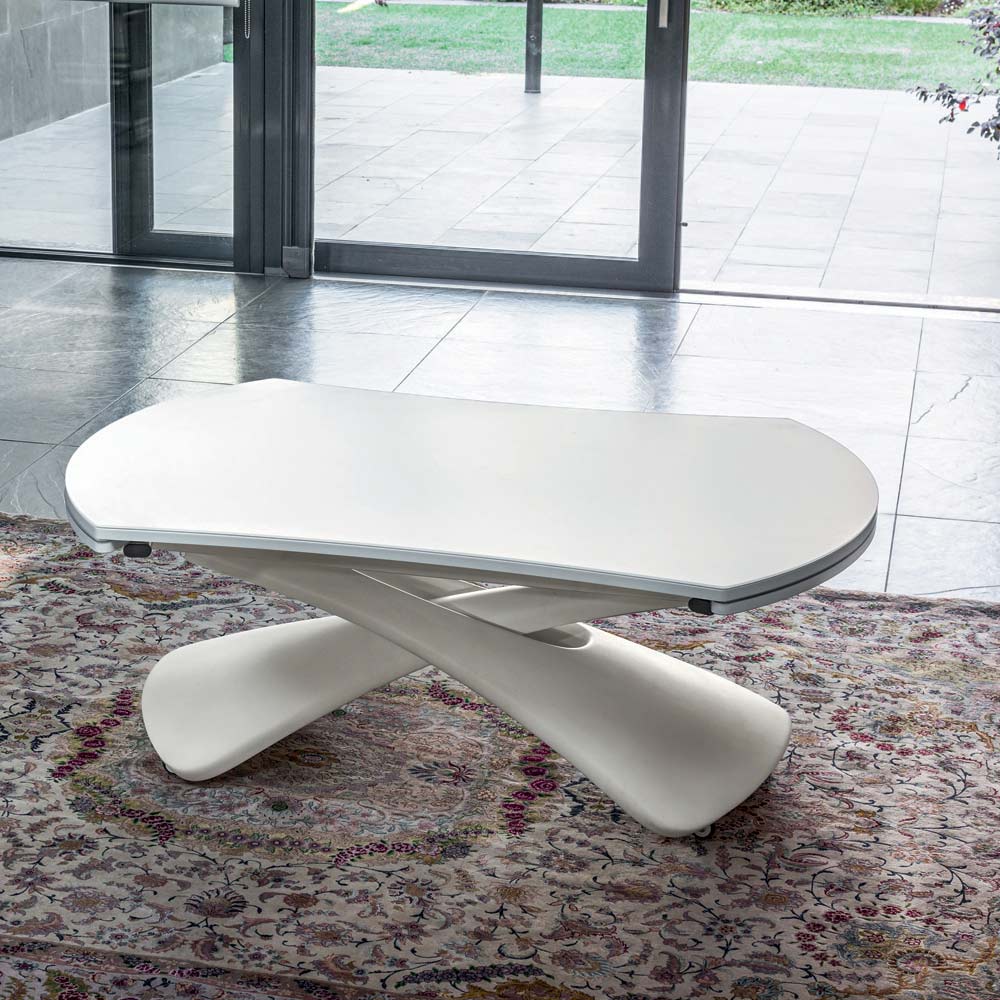 Konferenční stolek přestavitelný na jídelní stůl s kovovou podnoží a skleněnou deskou, vyrobený v Itálii.