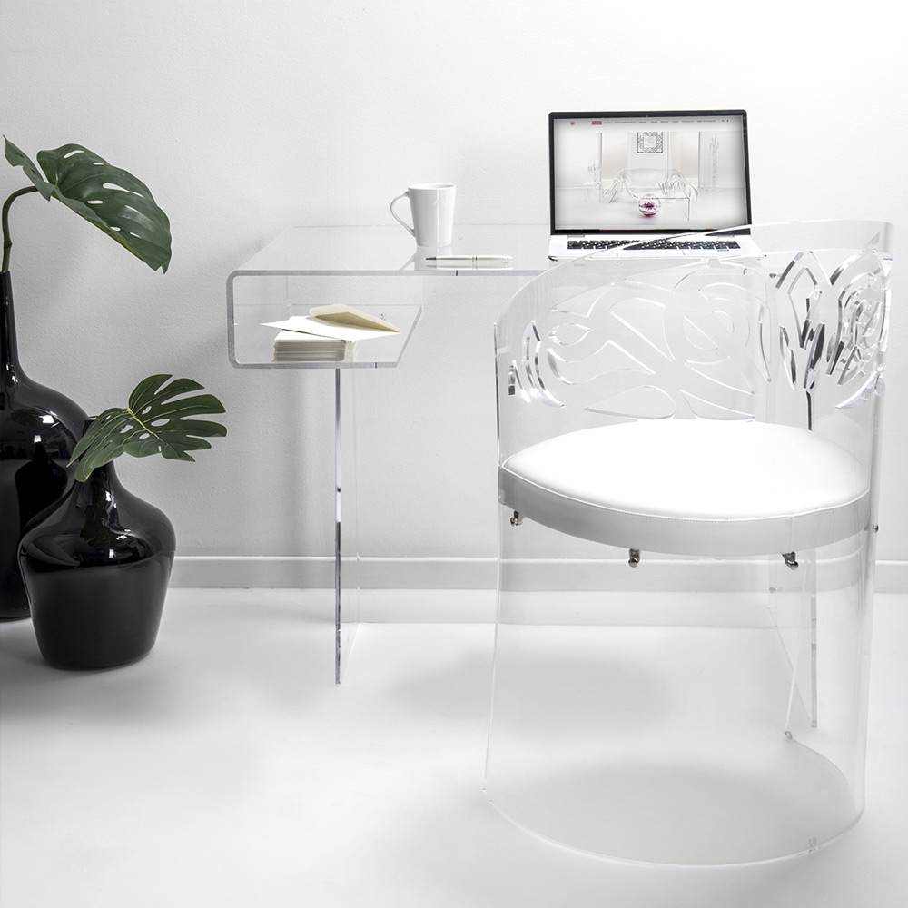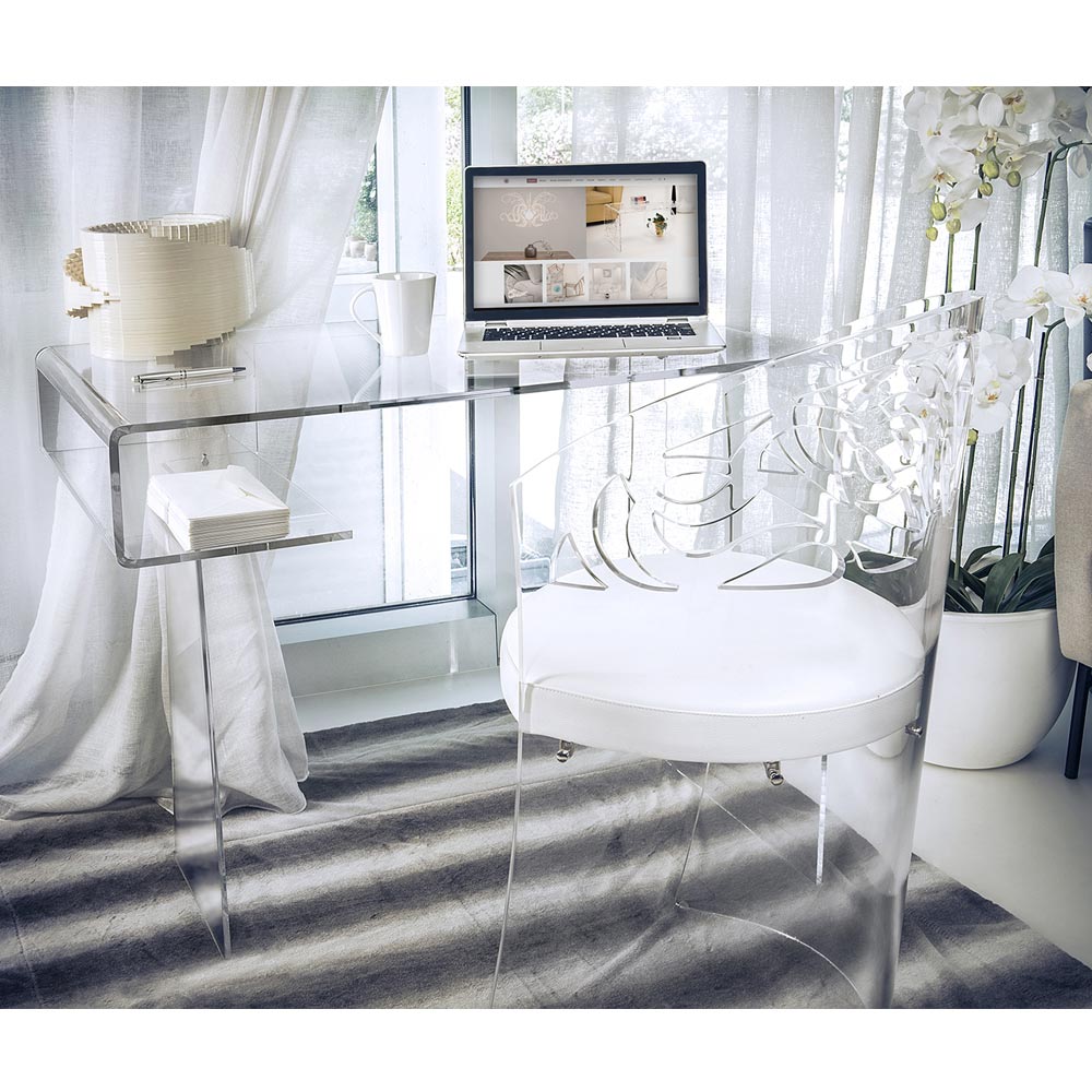Moderní psací stůl z průhledného plexiskla s policí Made in Italy.