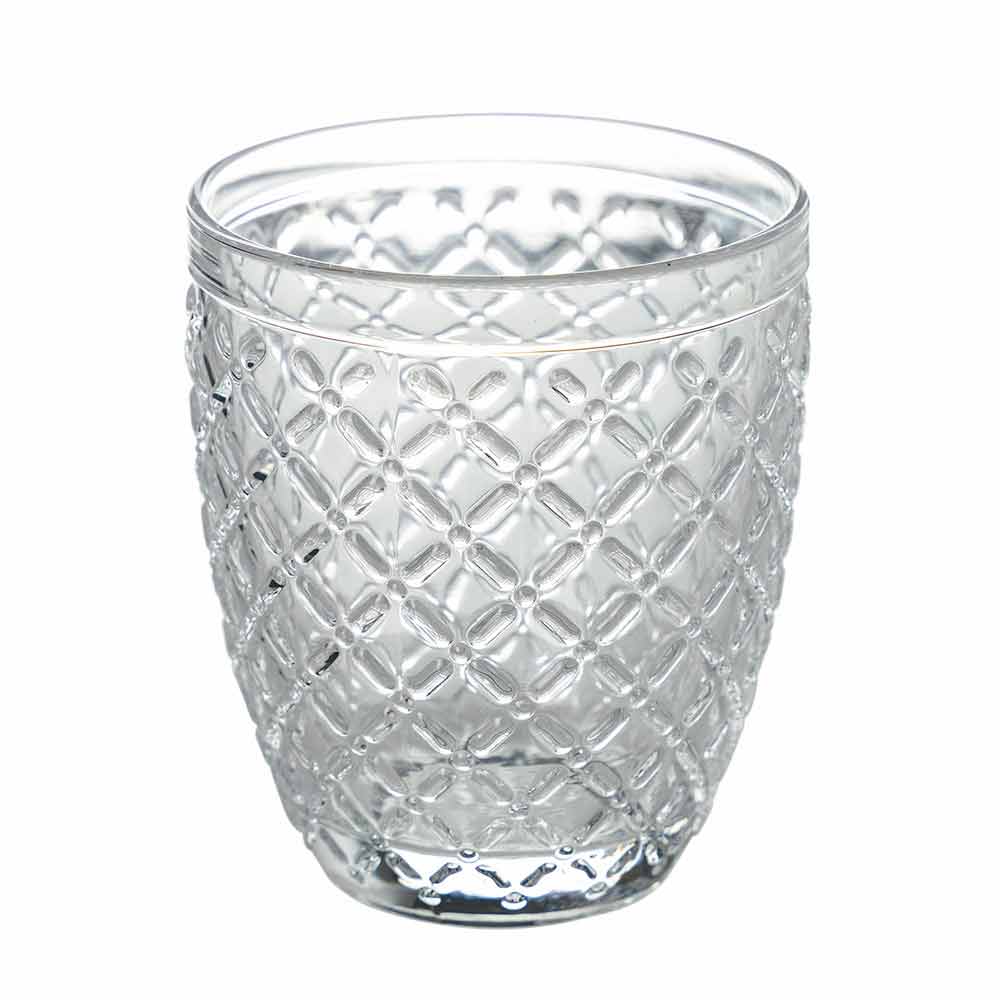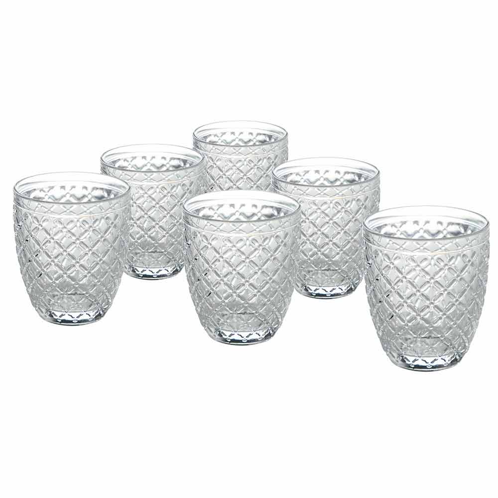 Sada průhledných barevných sklenic na vodu ve skle s vyřezávanými dekoracemi, 12 kusů.
