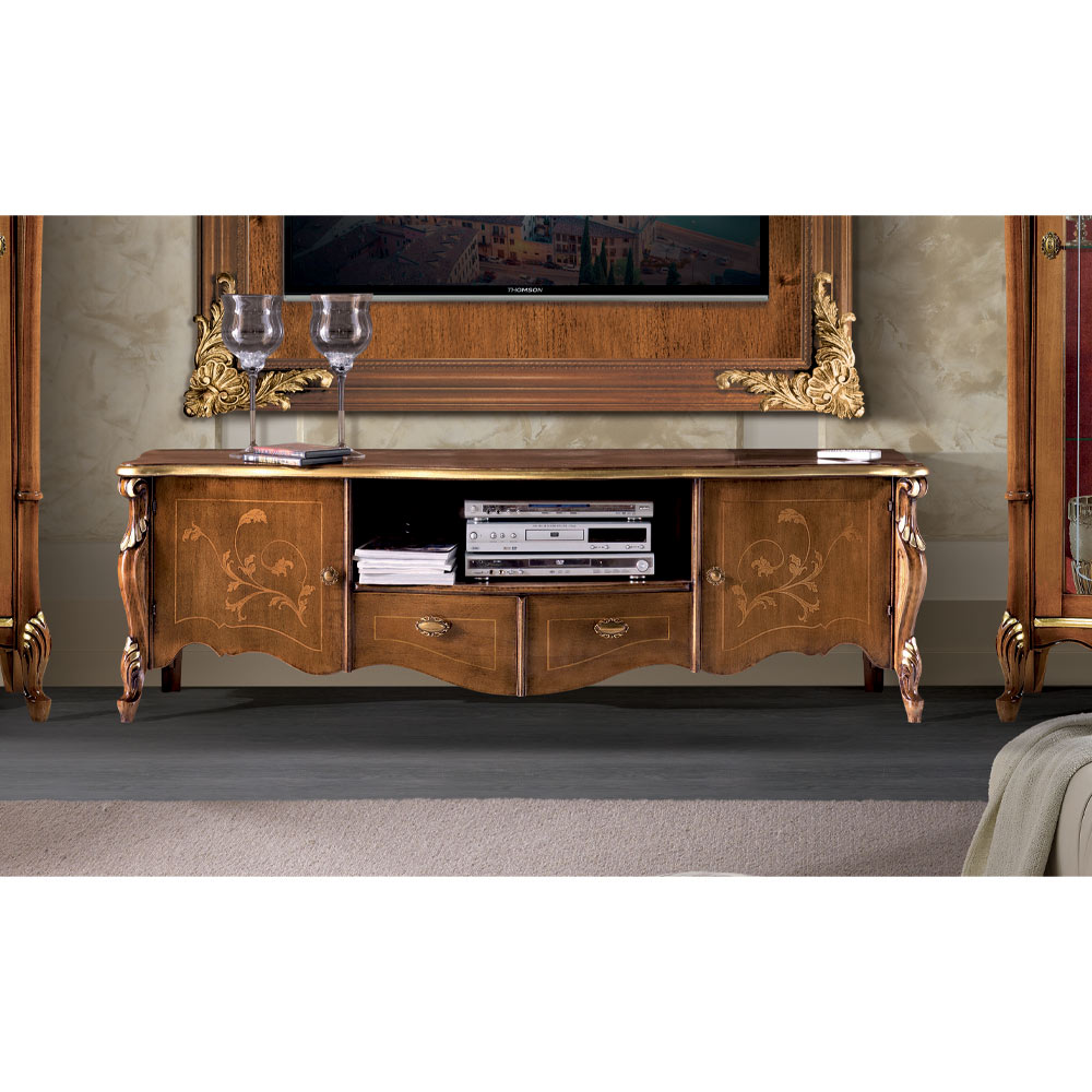 TV stolek do obývacího pokoje v klasickém stylu se 2 dvířky, 2 zásuvkami a 1 přihrádkou, vyrobený z ořechového dřeva Bassano s detaily ve starožitném zlatě. Unikátní a rafinovaný kus, kompletně vyrobený v Itálii zkušenými mistry řemeslníky , mistry umění, kteří každý kus odborně a elegantně dokončují. Výroba probíhá z vysoce kvalitních materiálů a ručně s maximální péčí a profesionalitou, což odlišuje produkty Made in Italy .