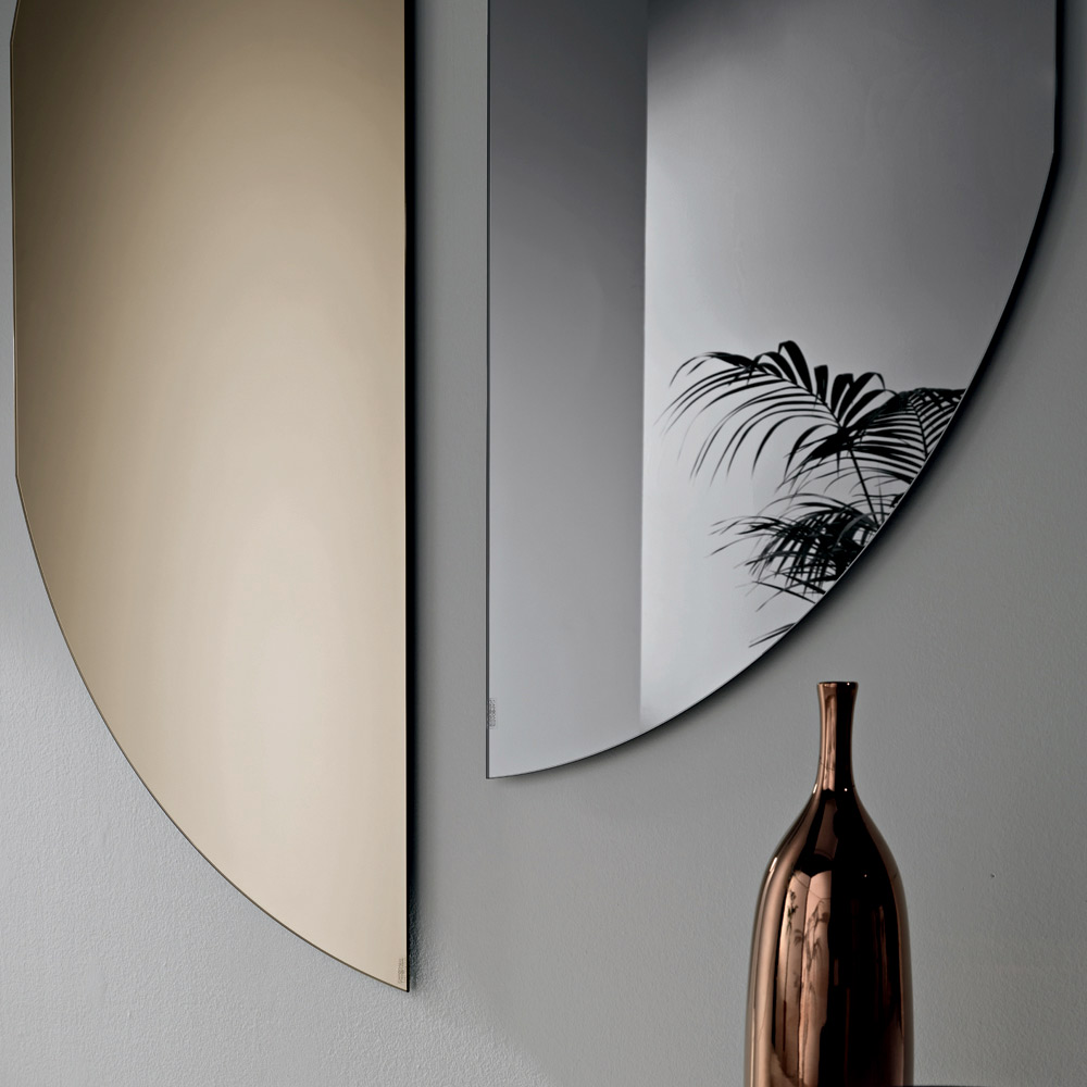 Zrcadlo má konturovaný tvar připomínající půlkruh s přerušenou křivkou , který vytváří originální a harmonickou siluetu. Tato základní geometrie dodává zrcadlu silný vizuální dojem a zároveň si zachovává minimalistickou a rafinovanou estetiku.
