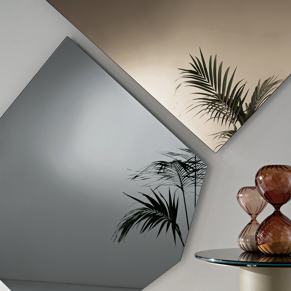 Zrcadlo je k dispozici v různých velikostech a lze jej použít samostatně nebo v kombinaci k vytvoření sofistikovaných geometrických efektů na zdi. Elegantní bronzová a kouřová povrchová úprava dodává reflexnímu povrchu hloubku a teplo.
