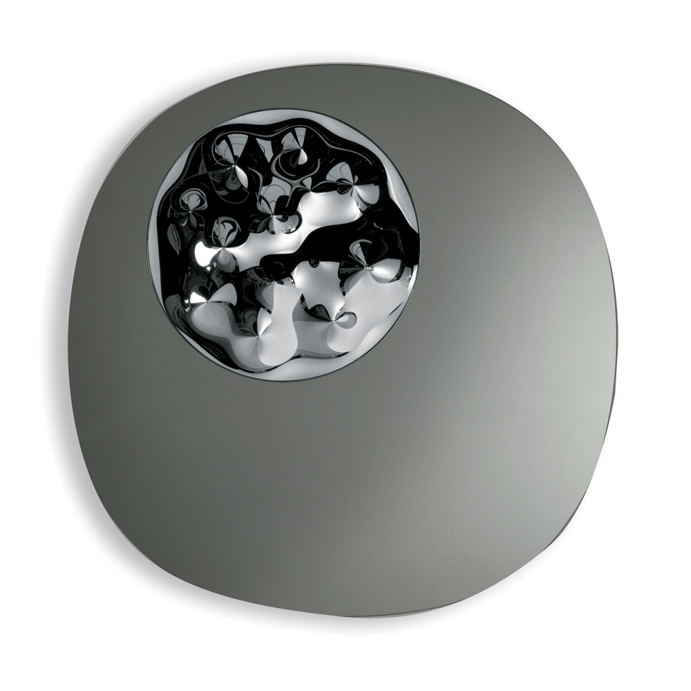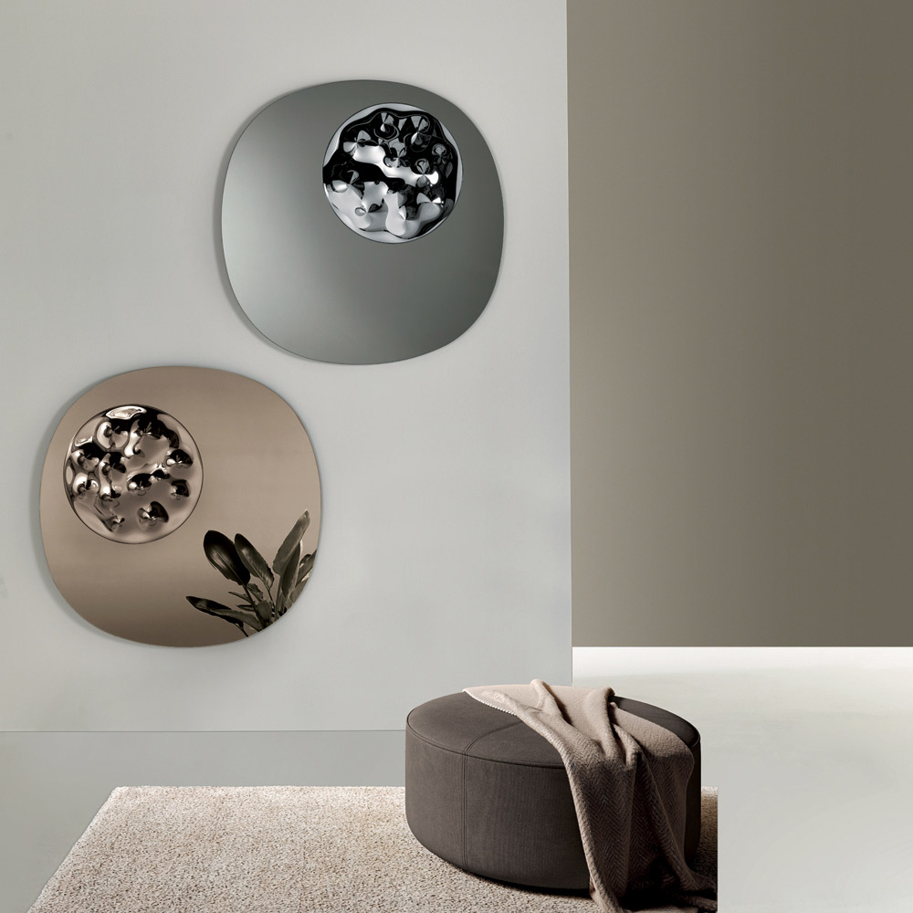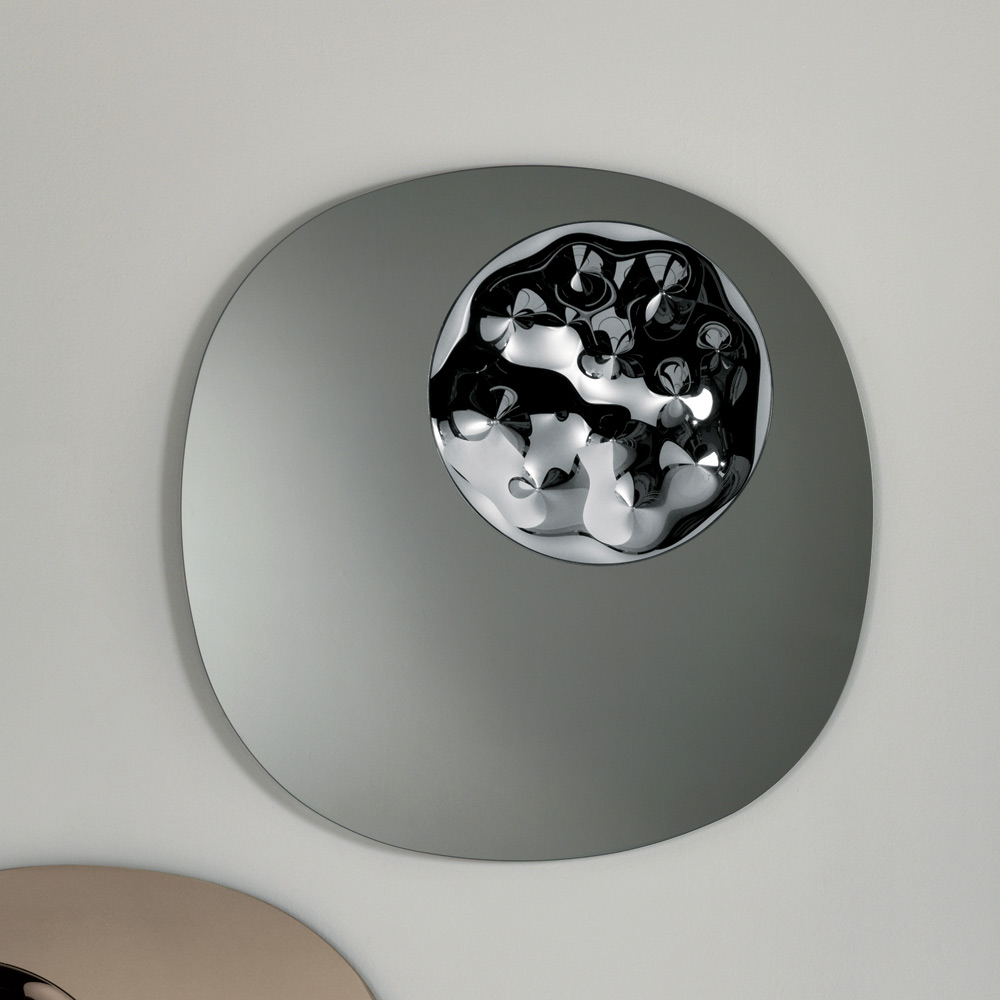 Design zdobí výrazná kruhová vložka z obloukového skla tón v tónu , umístěná na jedné straně rámu. Tento detail vytváří rafinovanou hru světla a odrazů, která obohacuje povrch zrcadla o originální a moderní nádech.