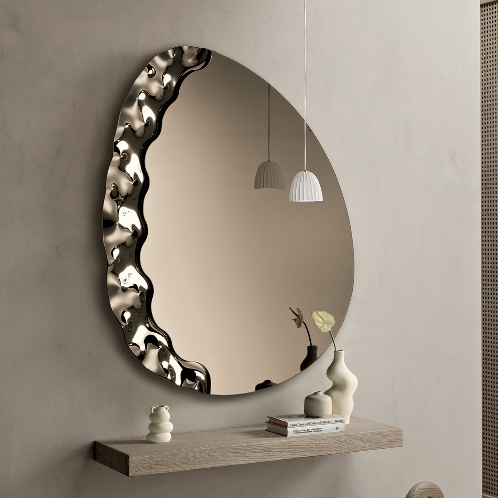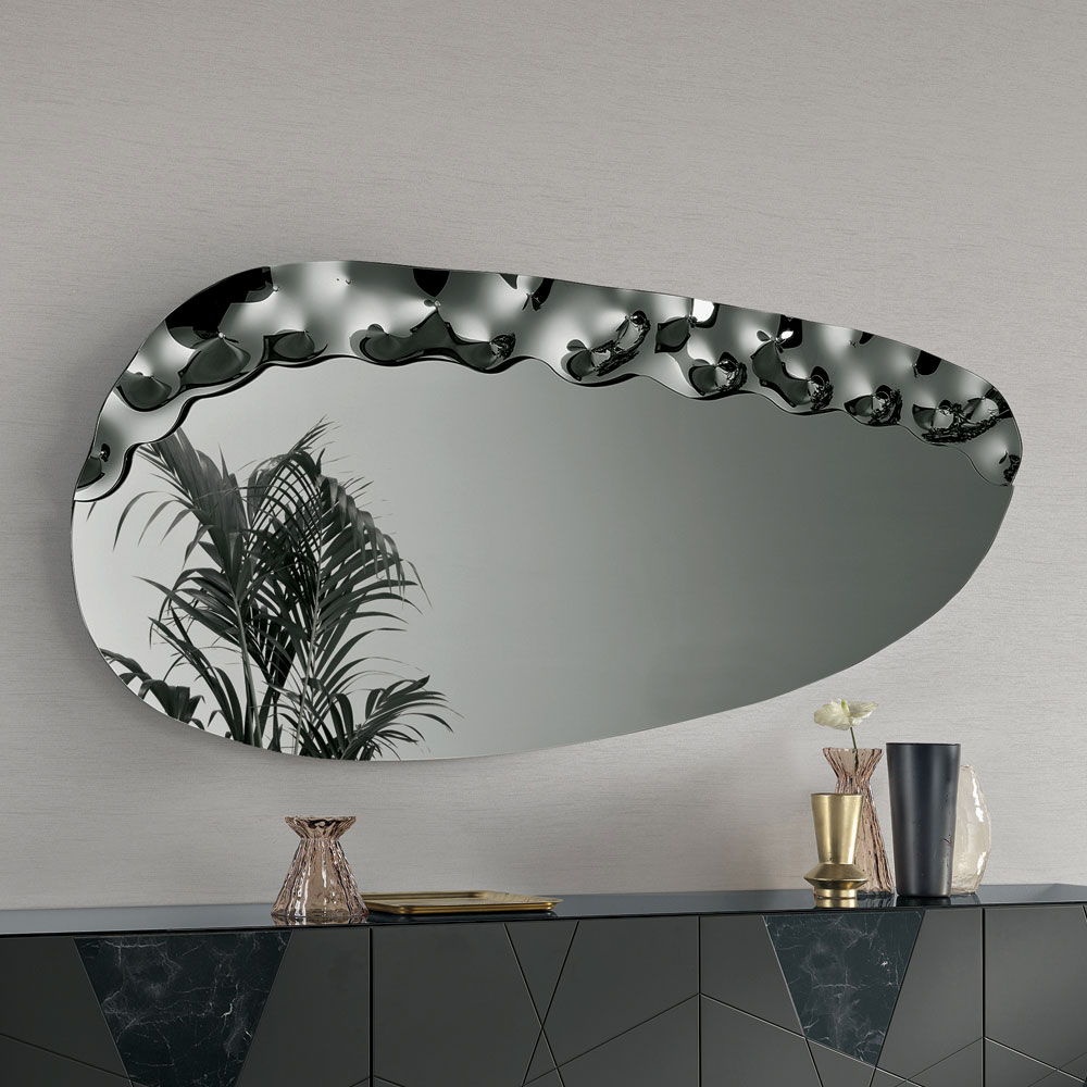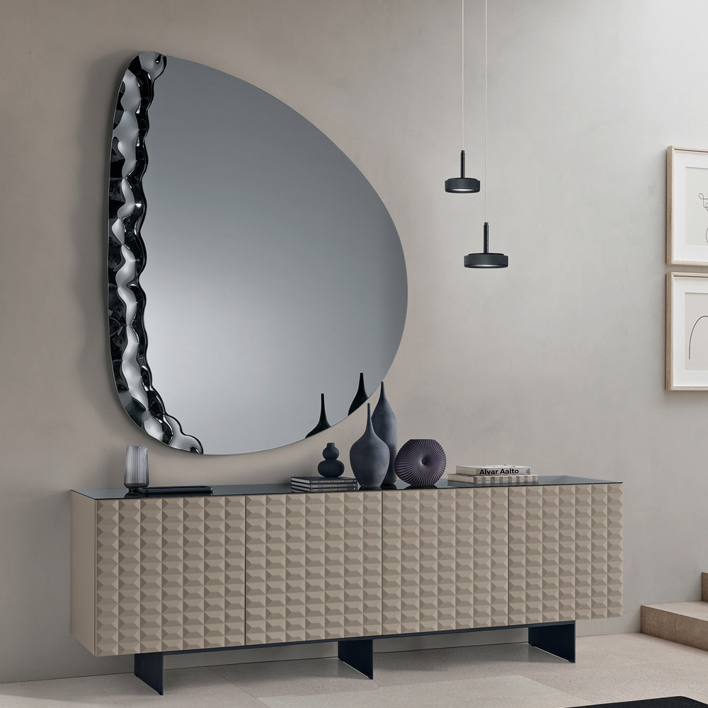 Charakteristickým rysem zrcadla je boční vložka z texturovaného skla tón v tónu , která vytváří rafinovanou souhru povrchů a textur. Tento dekorativní prvek působí jako základ pro zrcadlový panel a vytváří lehký a sofistikovaný vizuální efekt, který dodává kompozici hloubku.