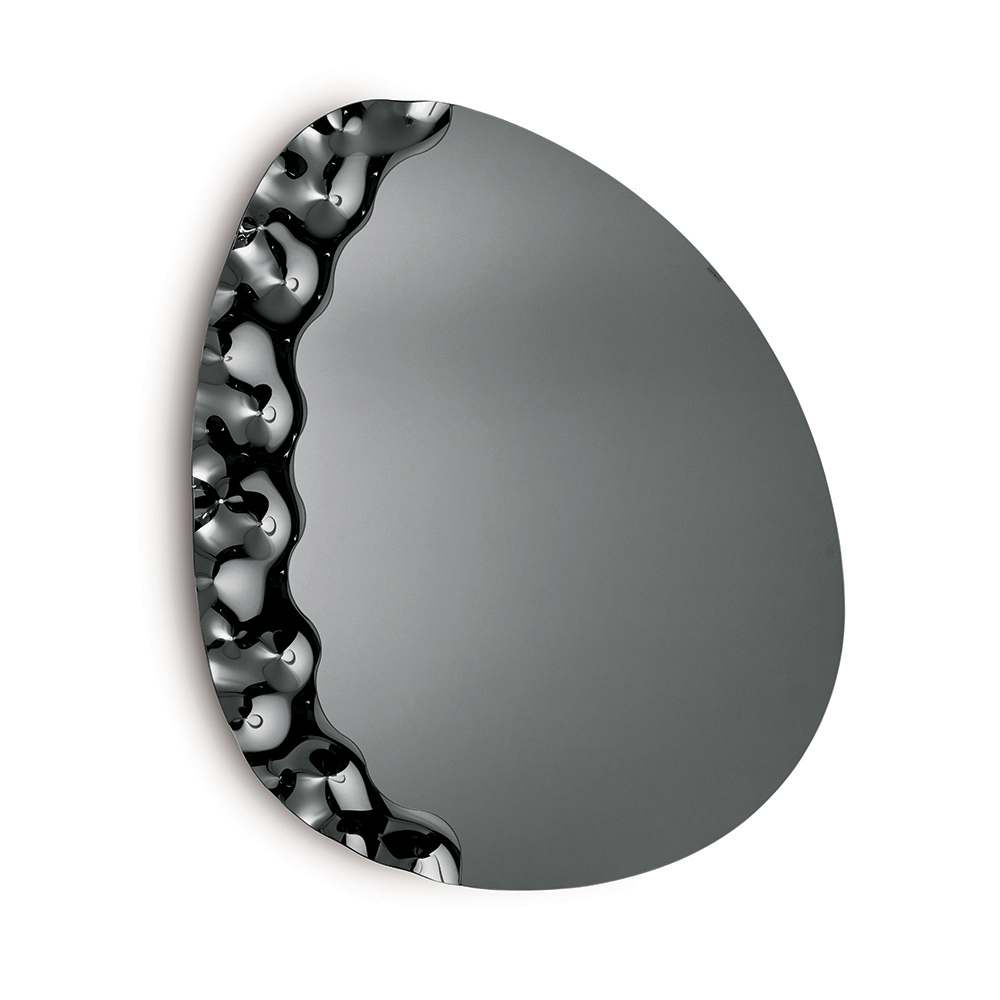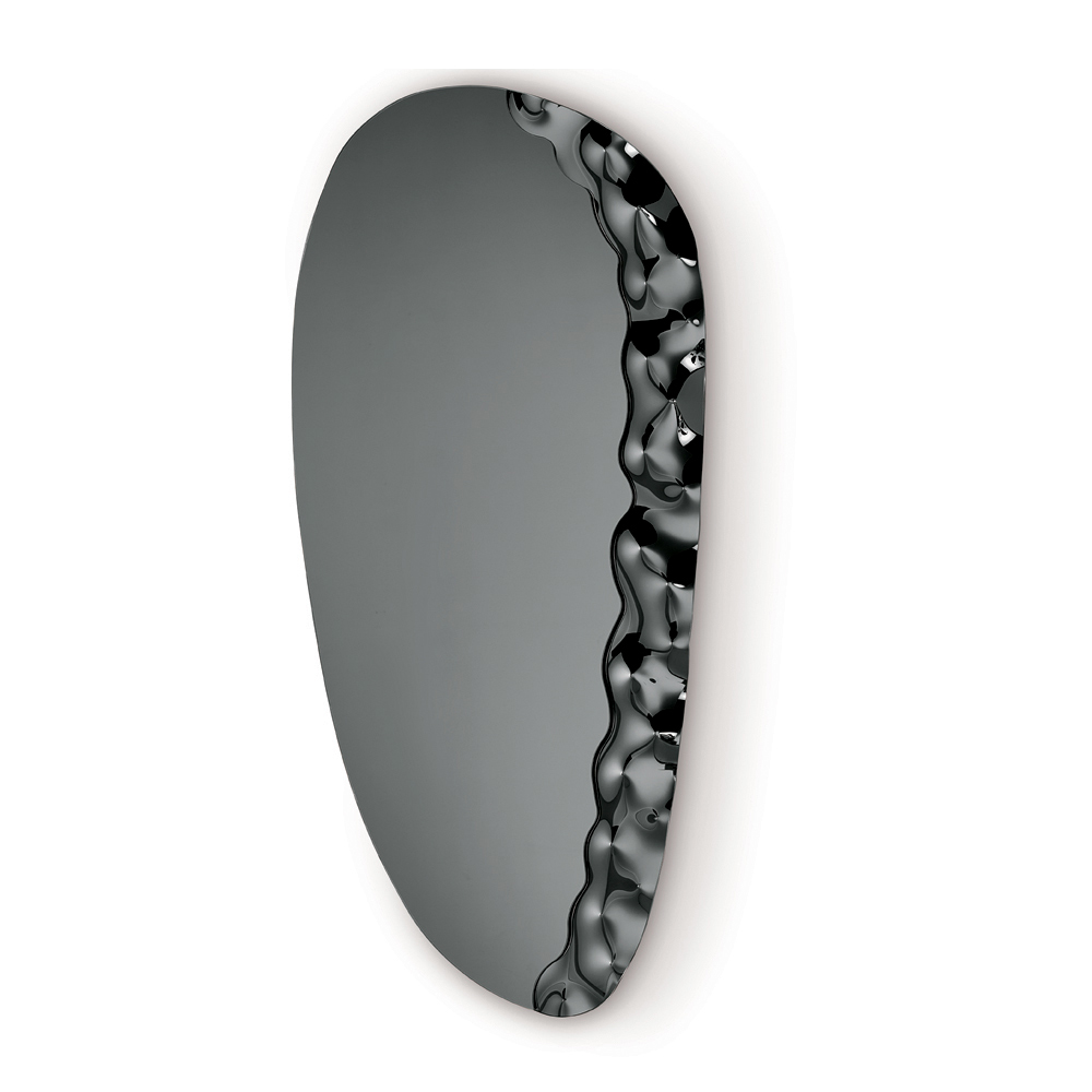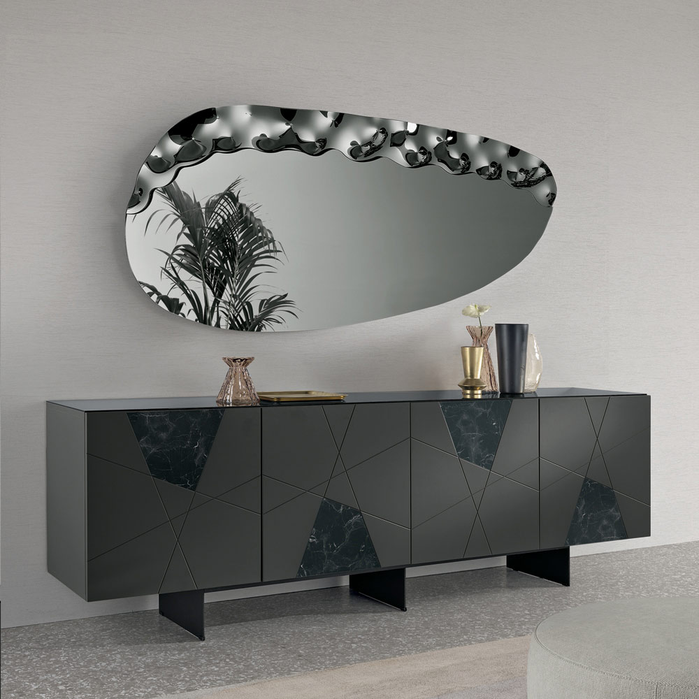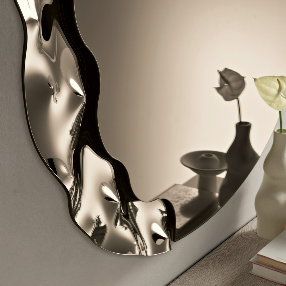 Charakteristickým rysem zrcadla je boční vložka z texturovaného skla tón v tónu , která vytváří rafinovanou souhru povrchů a textur. Tento dekorativní prvek působí jako základ pro zrcadlový panel a vytváří lehký a sofistikovaný vizuální efekt, který dodává kompozici hloubku.
