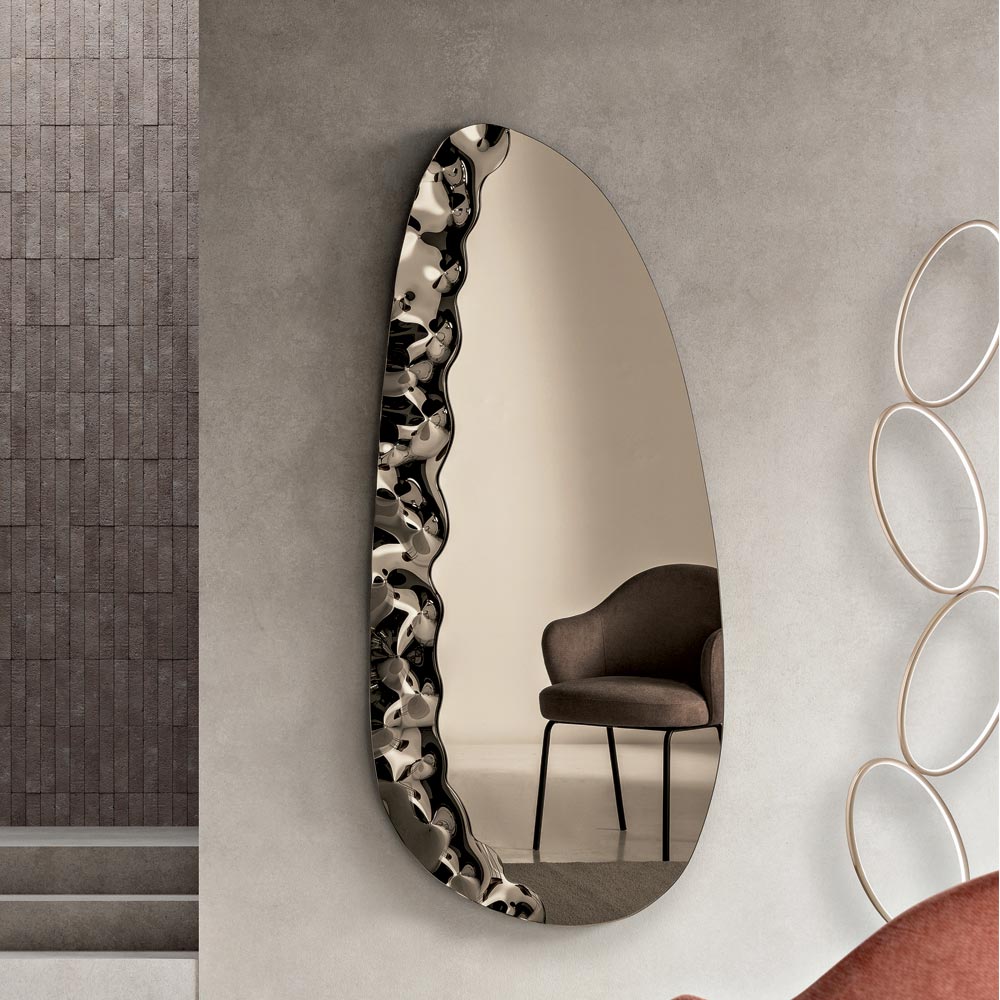Elegantní nástěnné zrcadlo navržené v Itálii , ideální pro zkrášlení prostor, jako je vstupní hala , obývací pokoj nebo ložnice . Jeho moderní design kombinuje jemné linie a texturované detaily, čímž se zrcadlo promění v rafinovaný dekorativní prvek, který dokáže elegantně zkrášlit stěnu.
