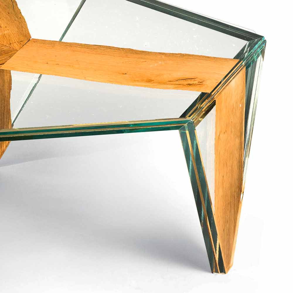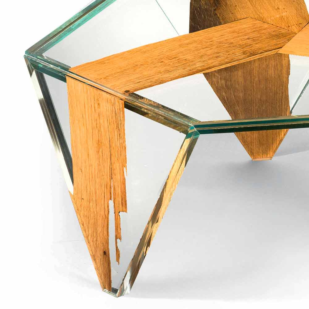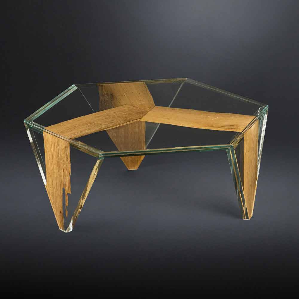 Konferenční stolek s šestihrannou deskou vyrobeno výhradně v Itálii ve vázaném skle (10 + 10 mm), do kterého je vložen tenký díl briccoly z dubového dřeva. Ze spojení mezi kouzlem dřeva a jeho žilkami, které připomínají přírodu, a nadčasovou elegancí skla , která připomíná průhlednost vody, se rodí exkluzivní bytový doplněk , který se vyznačuje silnou vytříbenou osobností . Jeho sílu představuje originální tvar a nádherná kombinace povrchových úprav a materiálů, které zvyšují jeho hodnotu, aniž by přitom opomněly základní funkční aspekt zdůrazněný 100% provedením Made in Italy a použitím kvalitních surovin. nabídnout dokonalý konferenční stolek, který je ideálním doplňkem každého obývacího prostoru se současnou chutí.