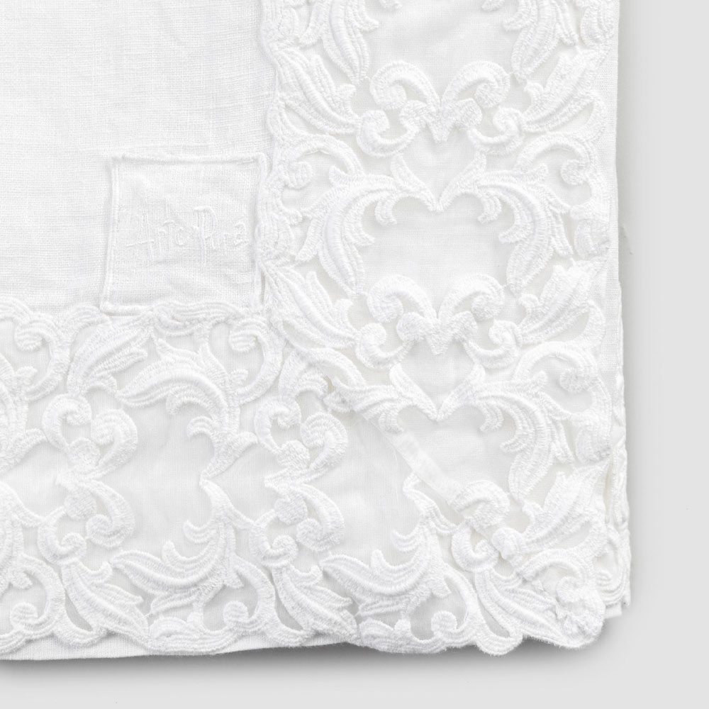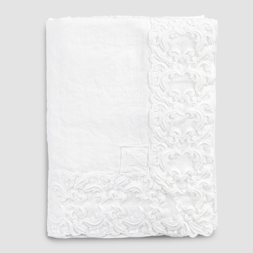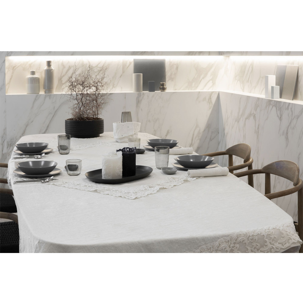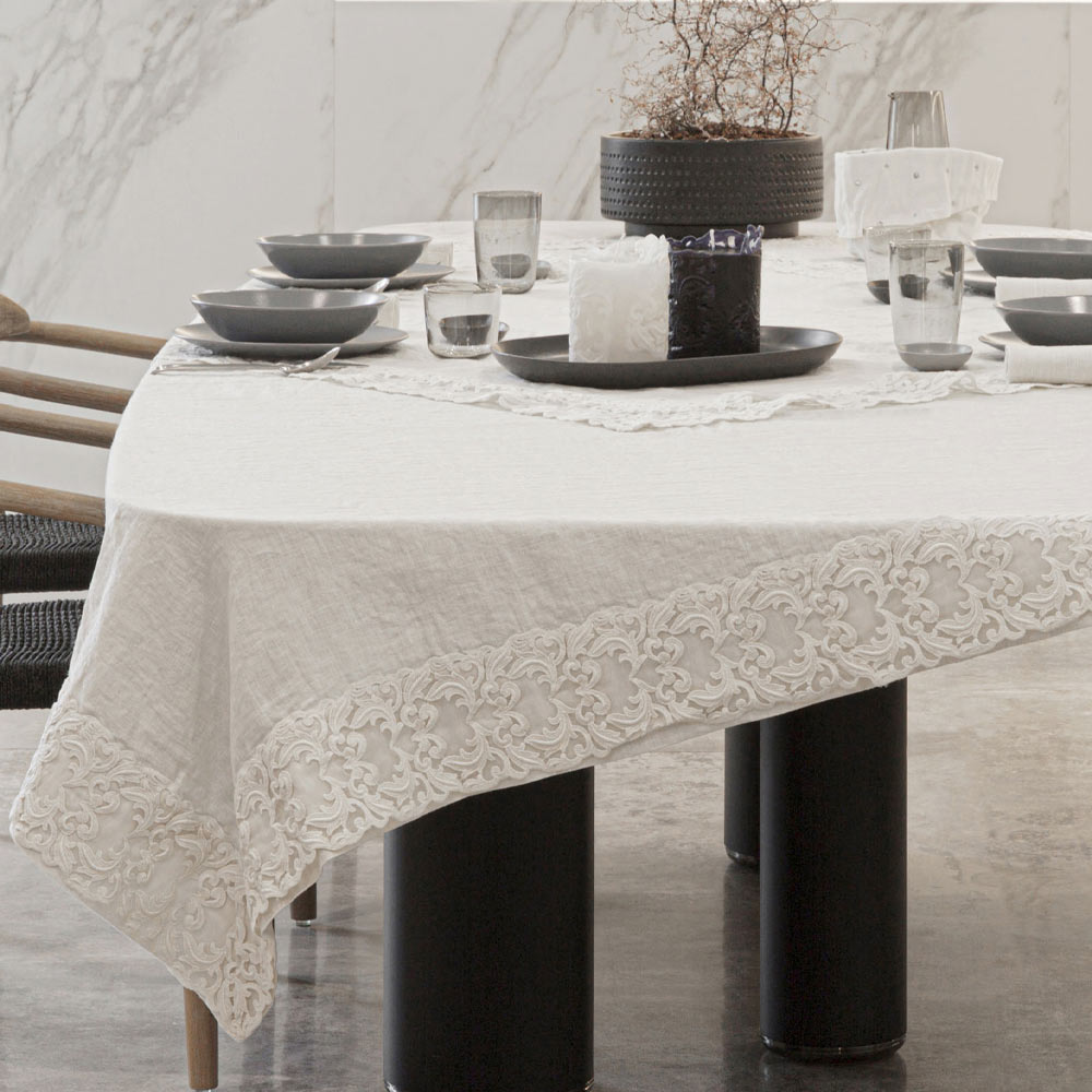 Obdélníkový ubrus z těžkého lnu s rámem a Farnese krajkou, vyrobený v Itálii.
