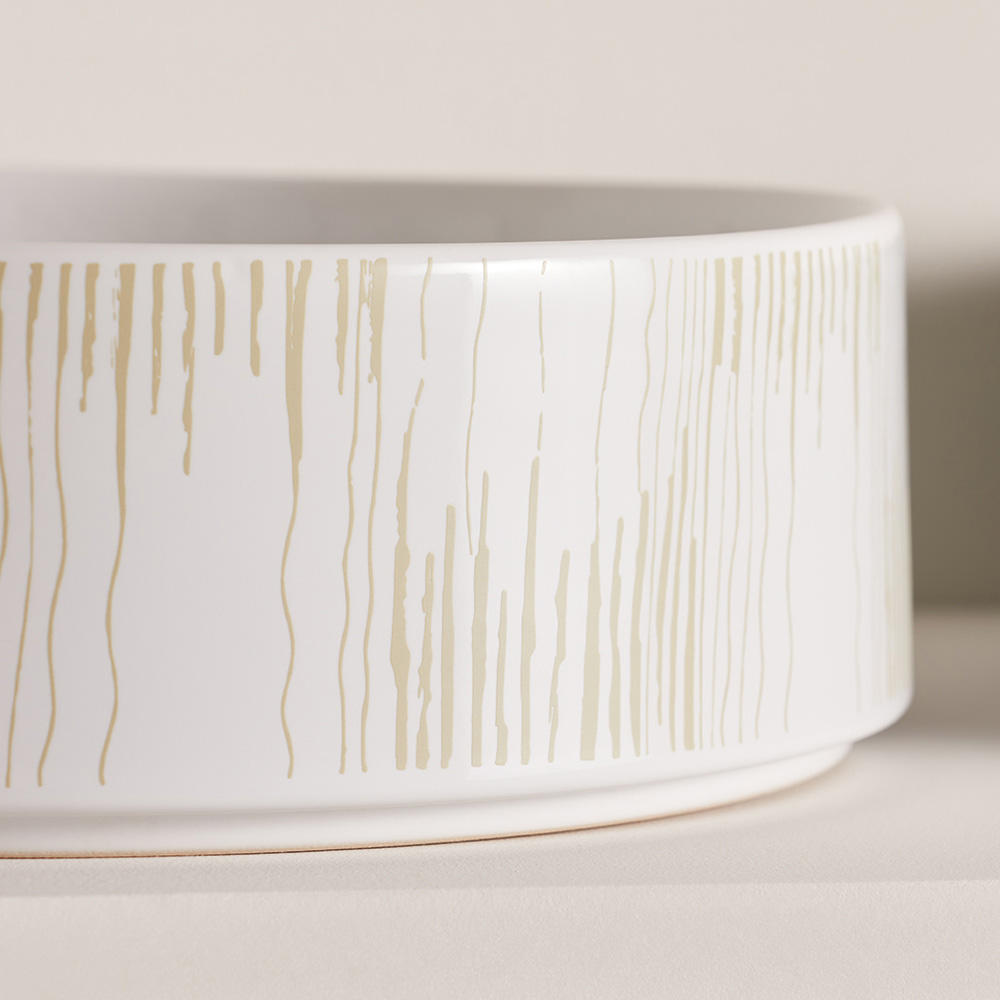 - lesklý bílý interiér, exteriér krémová kapková reliéfní dekorace na matném bílém smaltu