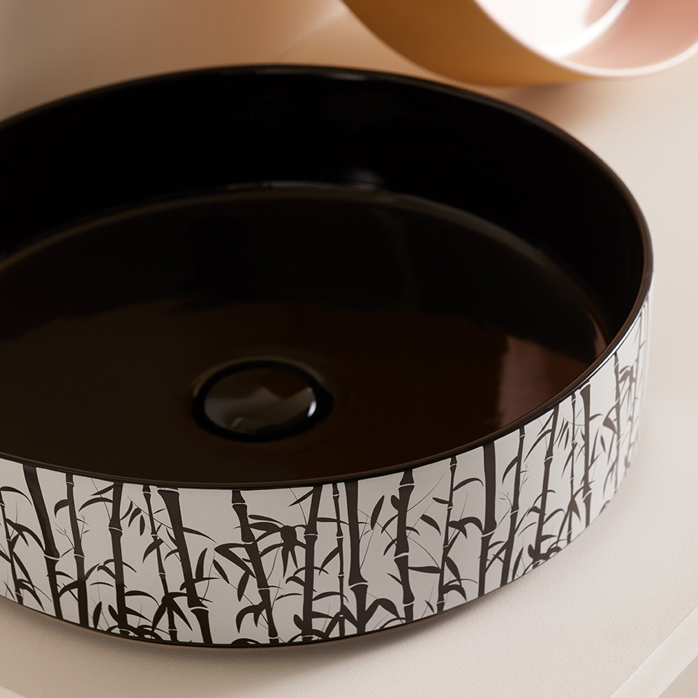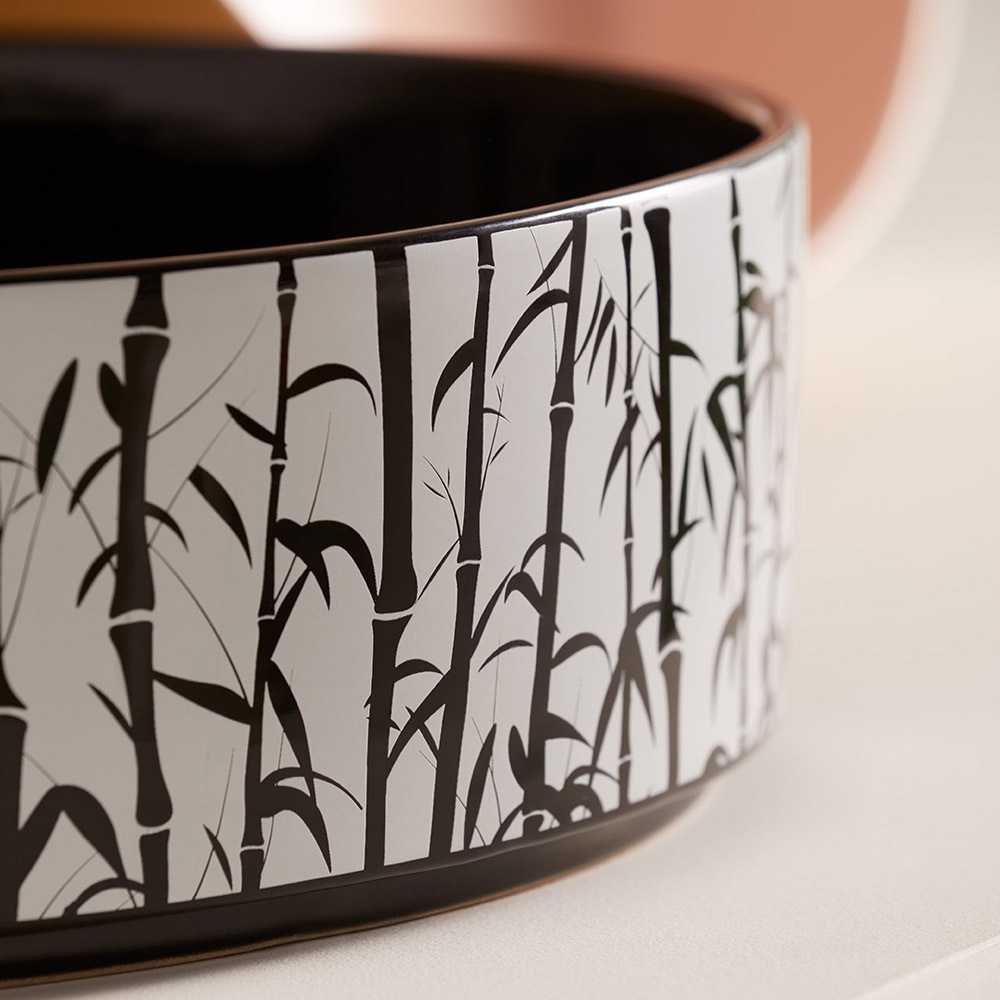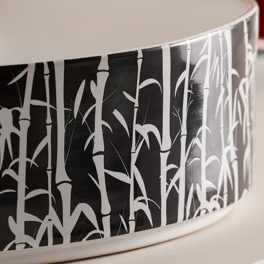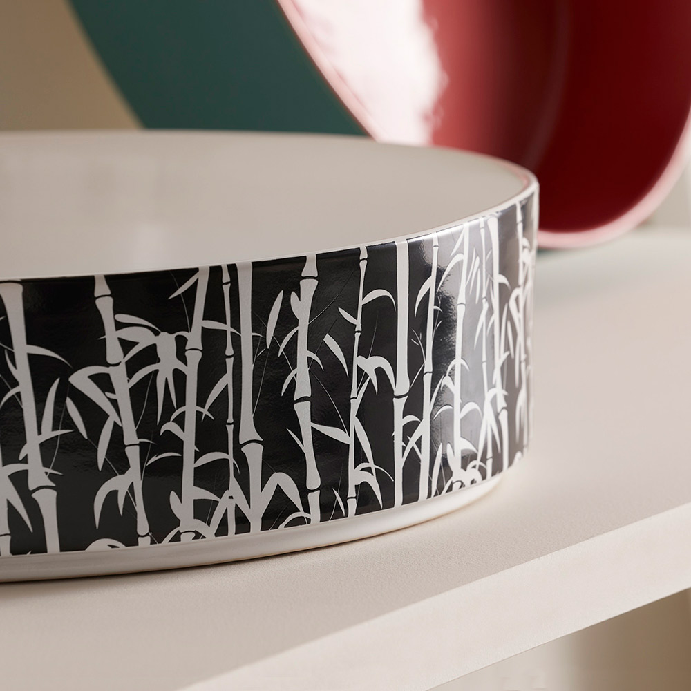 - lesklý černý interiér, exteriér bílá negativní reliéfní dekorace na matném černém smaltu (černý bambus)