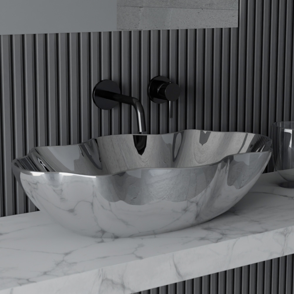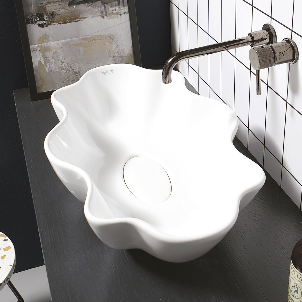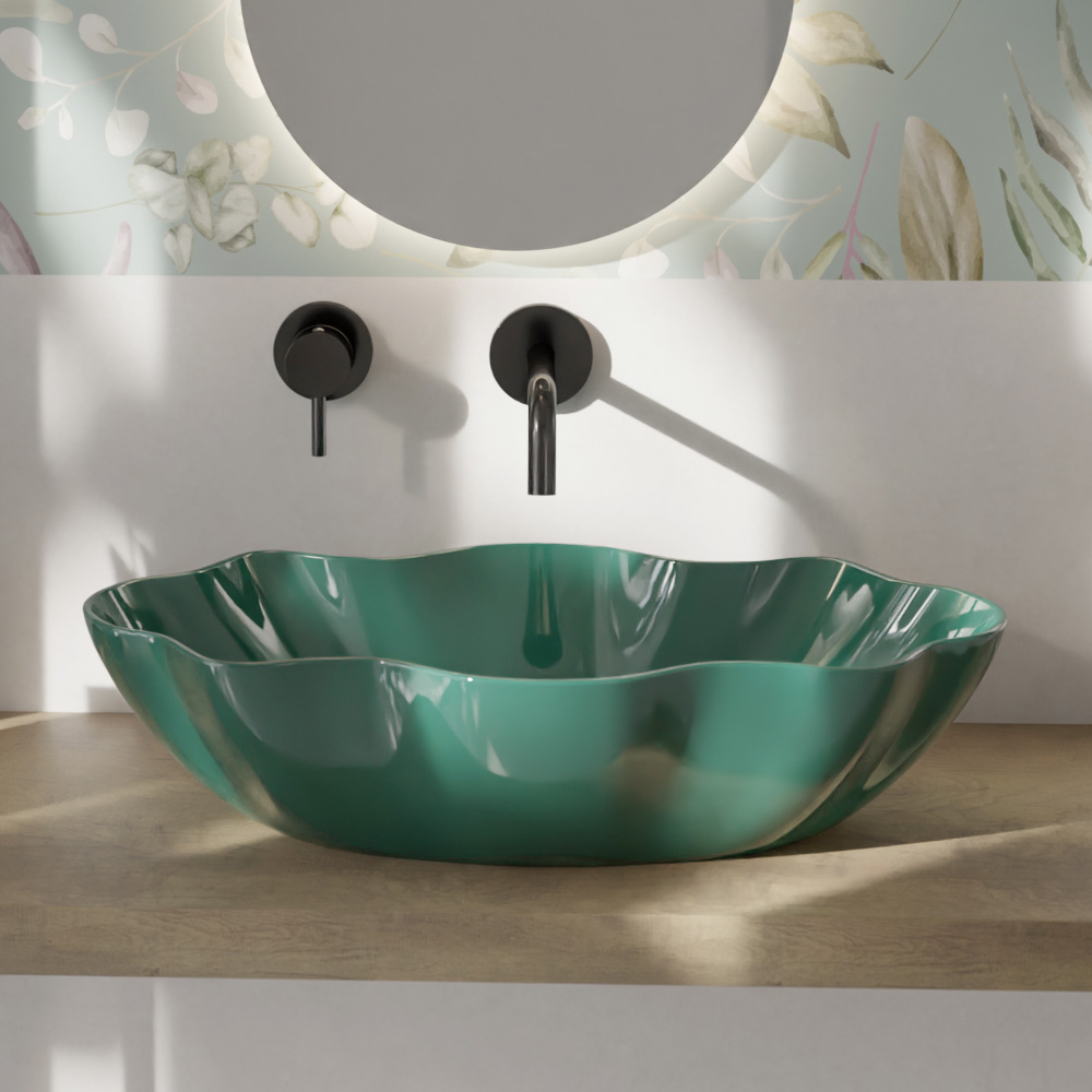 Keramické koupelnové umyvadlo na desku vyrobené v Itálii řemeslnou výrobou . Zařizovací doplněk do prostoru koupelny vyznačující se originálním a podmanivým stylem, jehož myšlenka vychází z touhy navrhovat řešení zařízení, která jsou vzdálená klasickým sériově vyráběným produktům. Výsledkem je umyvadlo s exkluzivní estetikou , které přitahuje pozornost díky své impozantní moderní osobnosti a zvláštnímu tvaru, který připomíná skořepinu.