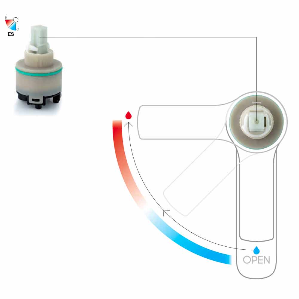 ES dodává studenou vodu, když je páka zvednutá ve střední poloze, čímž se zabrání požadavku na horkou vodu do kotle, což umožňuje následnou úsporu energie.