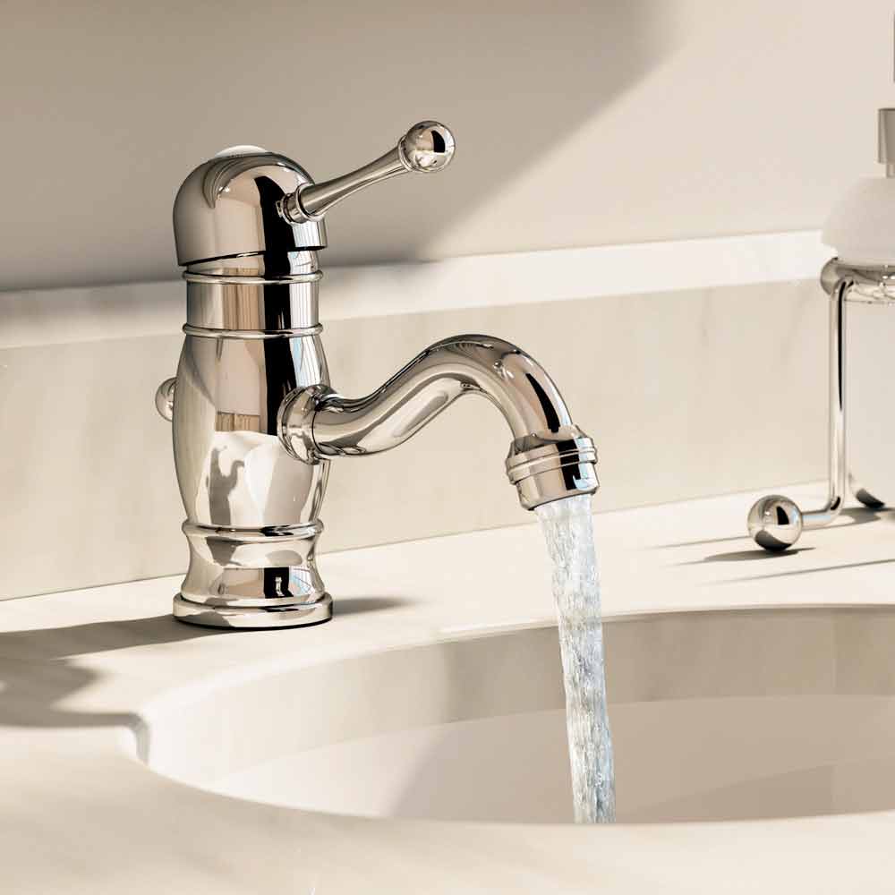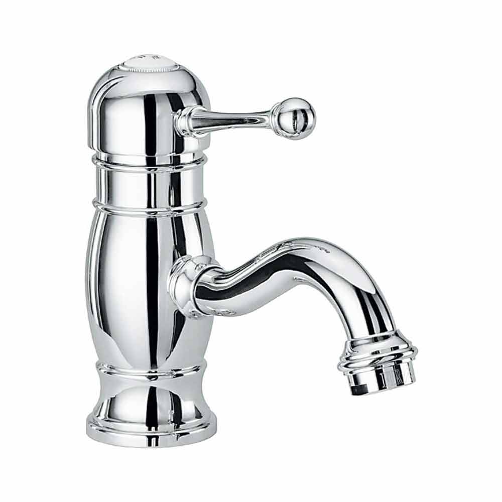 Umyvadlová baterie v klasickém designu v chromované mosazi ; Výška 150 mm a rozvor 130 mm, s odtokovým a výklopným mechanismem.
