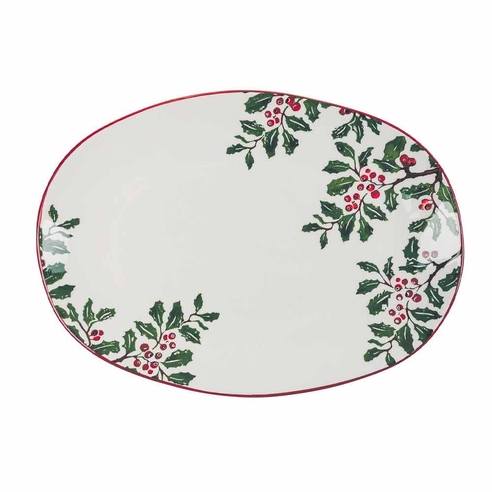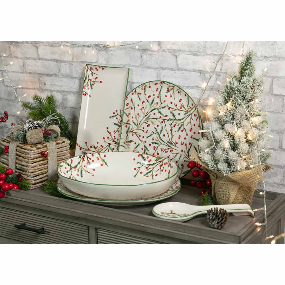 Ozdobte svůj domov a svůj stůl přirozeným stylem oválných vánočních talířův porcelánu s typickými vánočními dekoracemi vybranými z větviček cesmíny v kombinaci s červenou, symbolu Vánoc par excellence nebo bobulí cesmíny v kombinaci se zjemněním materiálu , což pomůže přinést nádech magie a učinit mise en place jednoduchým a elegantním.