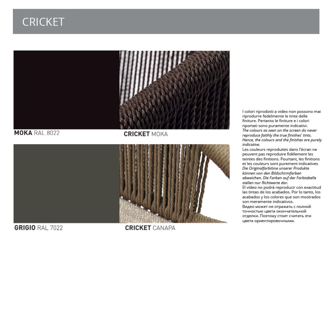 Sada se skládá ze 2 sezení v ruce pletené syntetické vlákno rámem v lakovaného hliníku. Židle Cricket by Varaschin může být použit jako zahradní křeslo v obývacím pokoji.