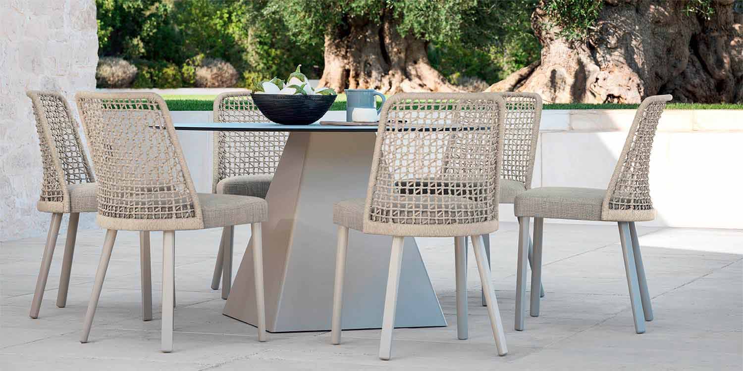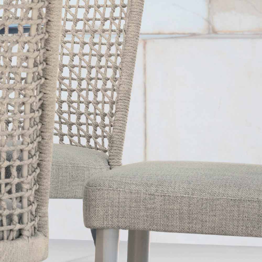 Emma je venkovní židle charakterizované strukturou ze syntetického vlákna ručně tkaného s béžovým práškovým hliníkovým rámem .