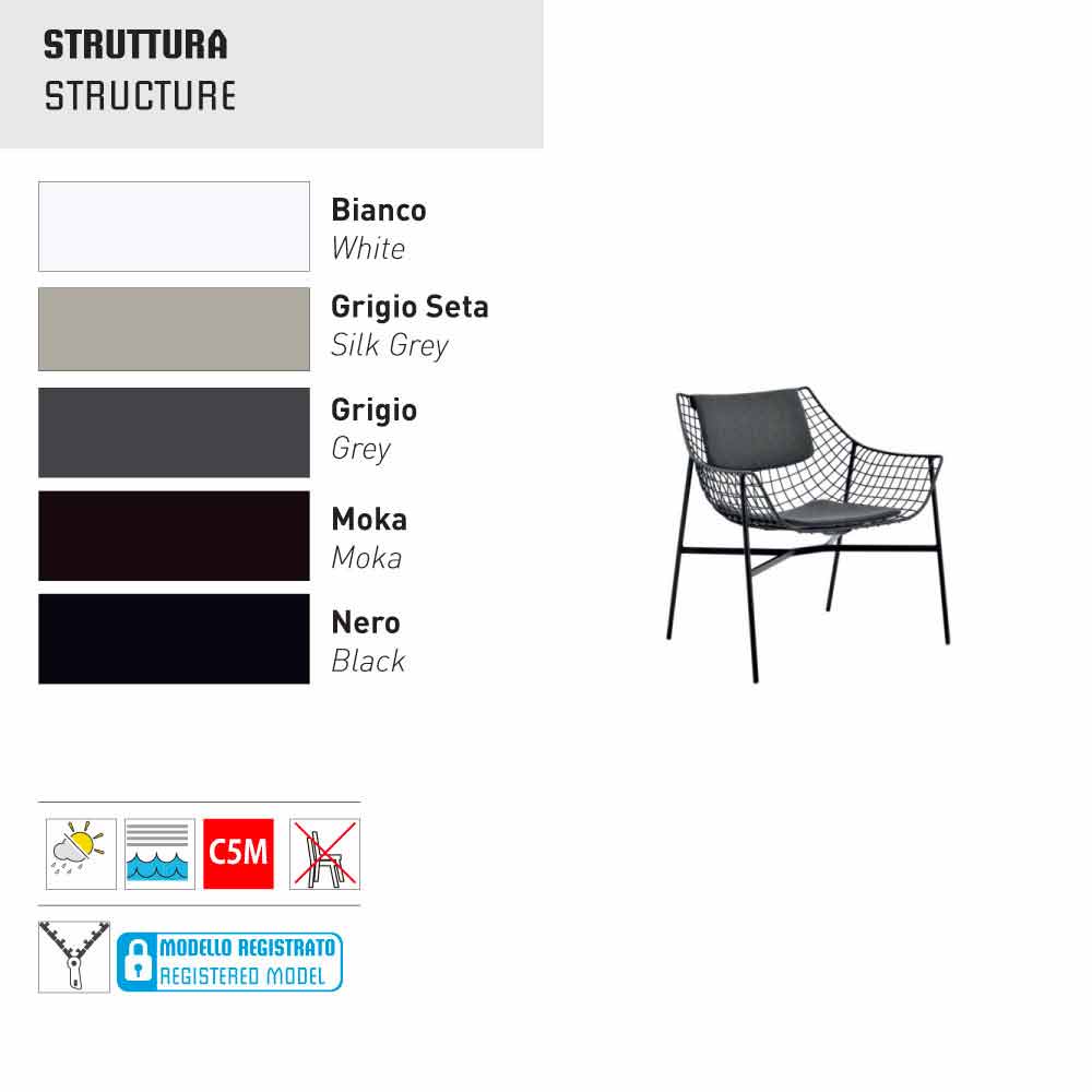 Venkovní textilní křeslo s práškovým lakovaným ocelovým rámem. Registrovaný model. Letní sada je extrémně všestranné křeslo, které lze používat jak ve venkovním prostoru, tak i v interiérech. Dodává se se sedákem a zadním polštářkem.