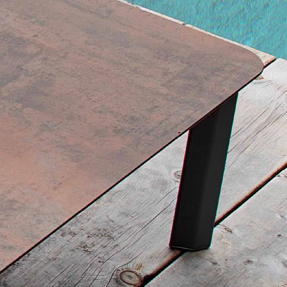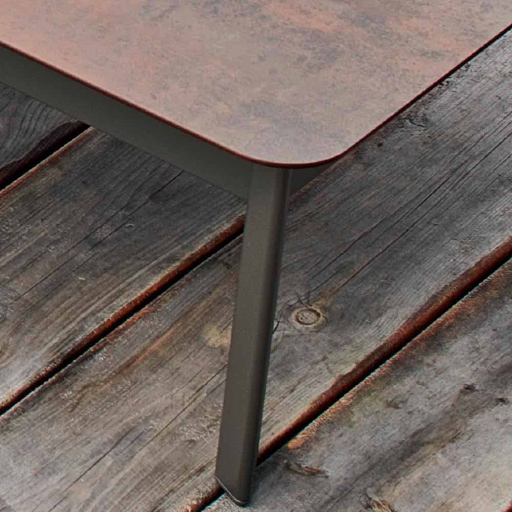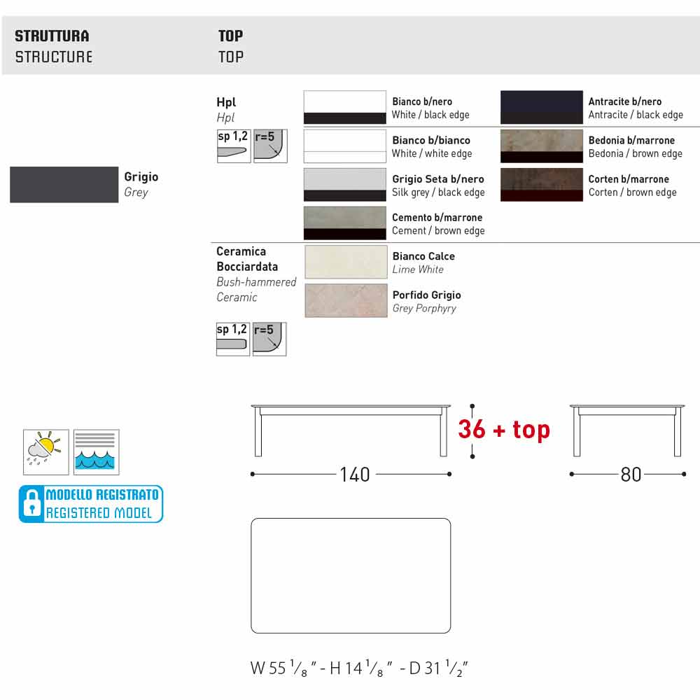 Systém je elegantní zahradní stůl se šedou práškovou hliníkovou strukturou ; se špičkou v HPL (sp 1.2) v provedení: setab šedá / černá, bílá b / černá, antracit b / černá, bílá b / bílá, cement b / hnědá, bedonia b / hnědá, korten b / hnědá ; nebo s keramikou (sp. 1.2) v provedení: bílá vápna a šedá porfyr .