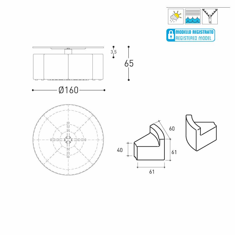 Pozn . Sbírka podporuje sluneční světlo a déšť. Doporučujeme pravidelnou údržbu a zvláštní pozornost věnovanou ochraně předmětů v případě nepříznivých povětrnostních podmínek (led, krupobití, teplotní změny, vlhkost, přetrvávající teplo nebo extrémní chlad). Trvanlivost a celistvost těchto položek závisí na péči, s jakou jsou udržovány. U hliníkových a ocelových výrobků (43, 304Ep, 316), i když jsou chráněny úpravami a povrchovými úpravami vhodnými pro venkovní použití, je nezbytné zabránit stagnování vody uvnitř samotného výrobku. Ve skutečnosti všechny výrobky představují technické perforace nezbytné pro aplikaci ochranných úprav a povrchových úprav. Zavedení vody do těchto otvorů a její stagnace může způsobit vznik rzi vnitřní části potrubí.
