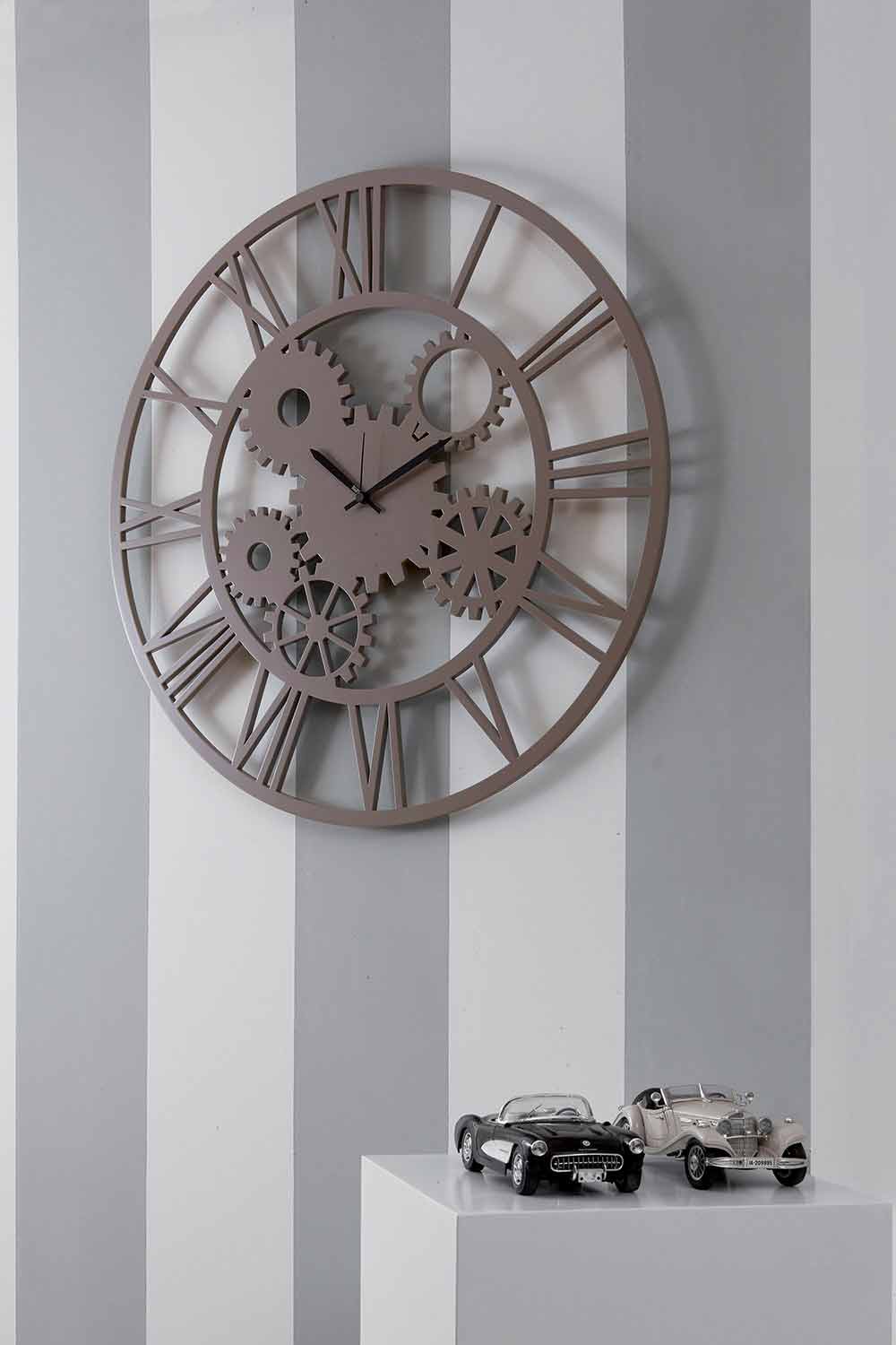 Velké nástěnné hodiny v ošuntělém stylu, kulatý design v bílé, šedé nebo taupe dřeva, vyrobené v Itálii.