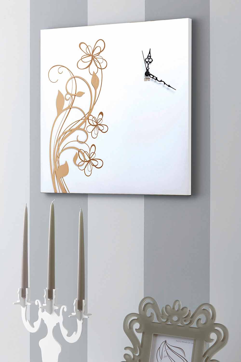 Čtvercový design nástěnné hodiny z bílého dřeva s květinovou výzdobou z přírodního dřeva, moderní a vyrobené v Itálii.