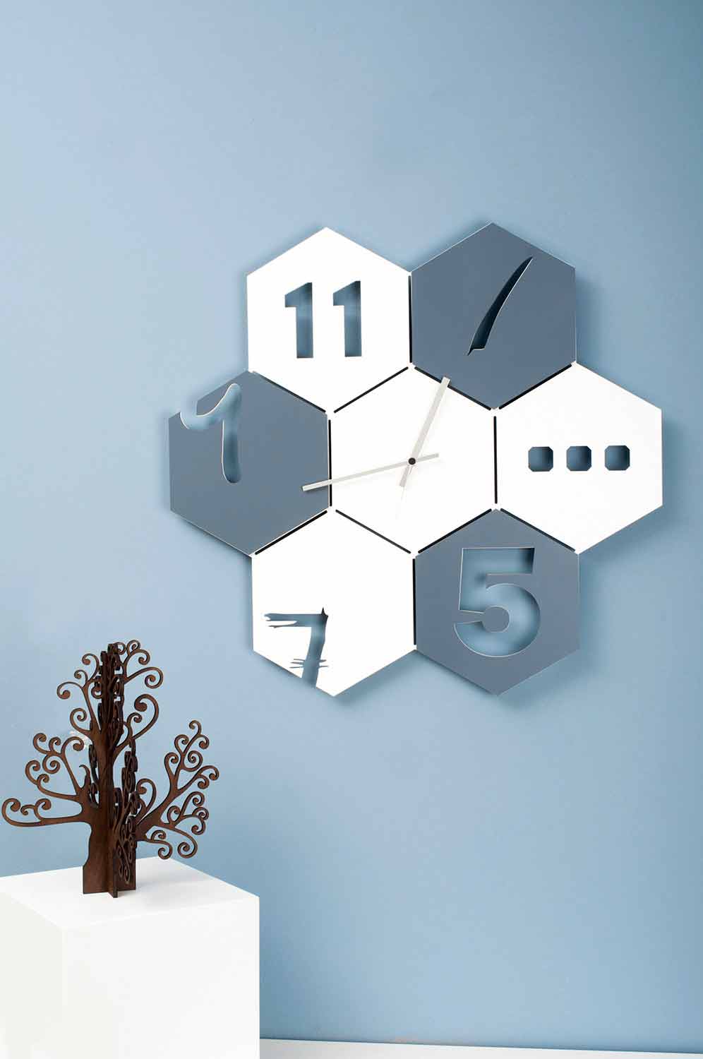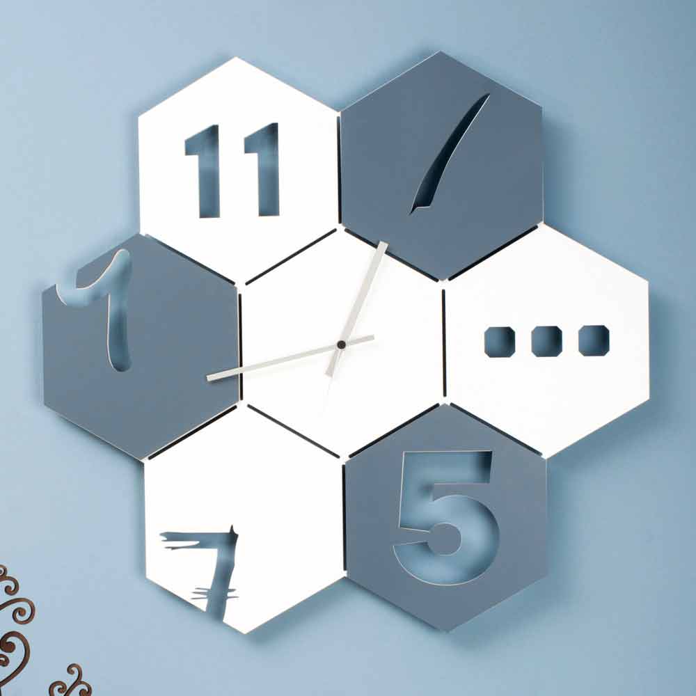 Velké nástěnné hodiny, design vyrobený z šestiúhelníků v bílé a barevné dřevo vyrobené v Itálii.