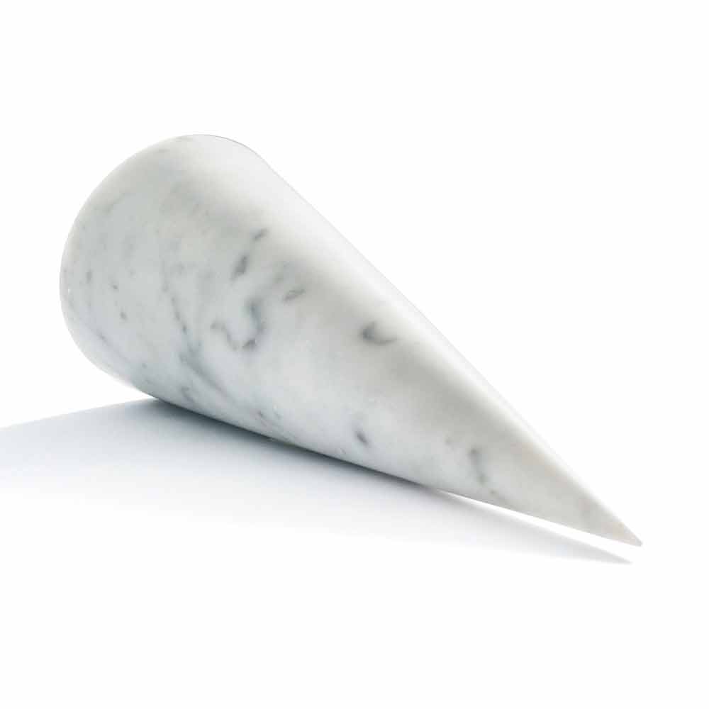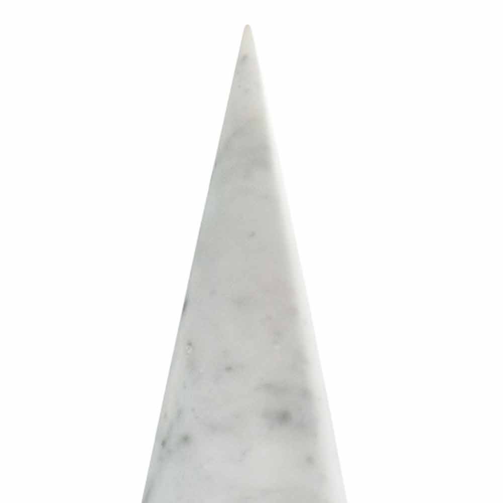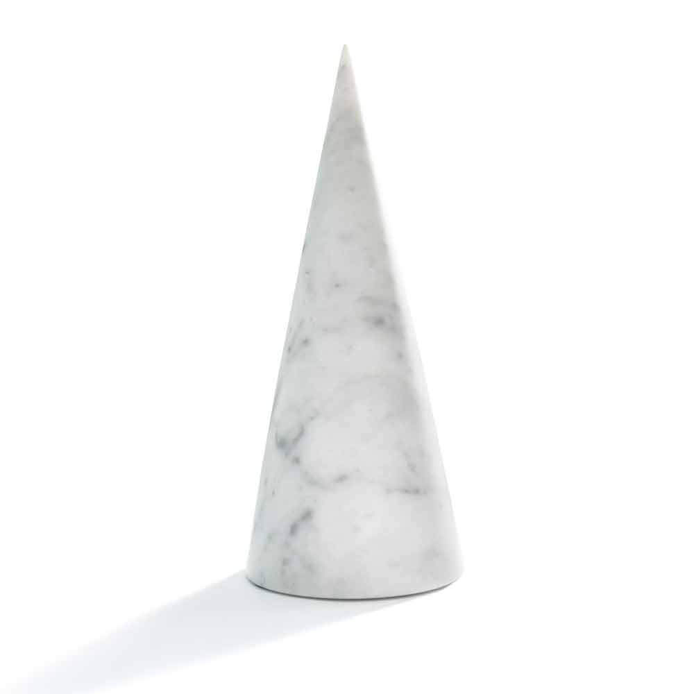 Velký dekorativní kužel z bílého mramoru Carrara . Jedná se o jedinečný kus, protože každý použitý blok mramoru se liší od ostatních pro žíly a odstíny.