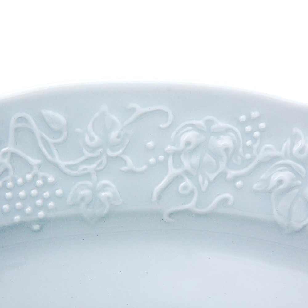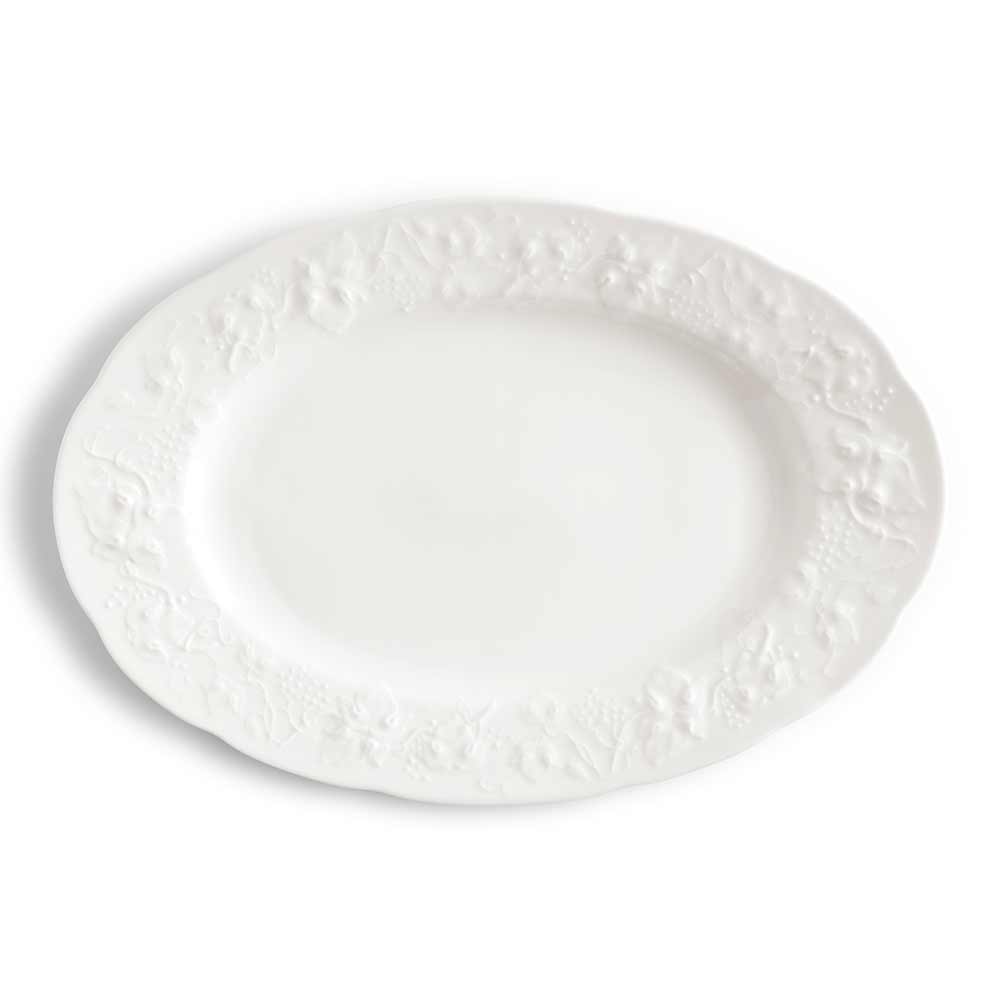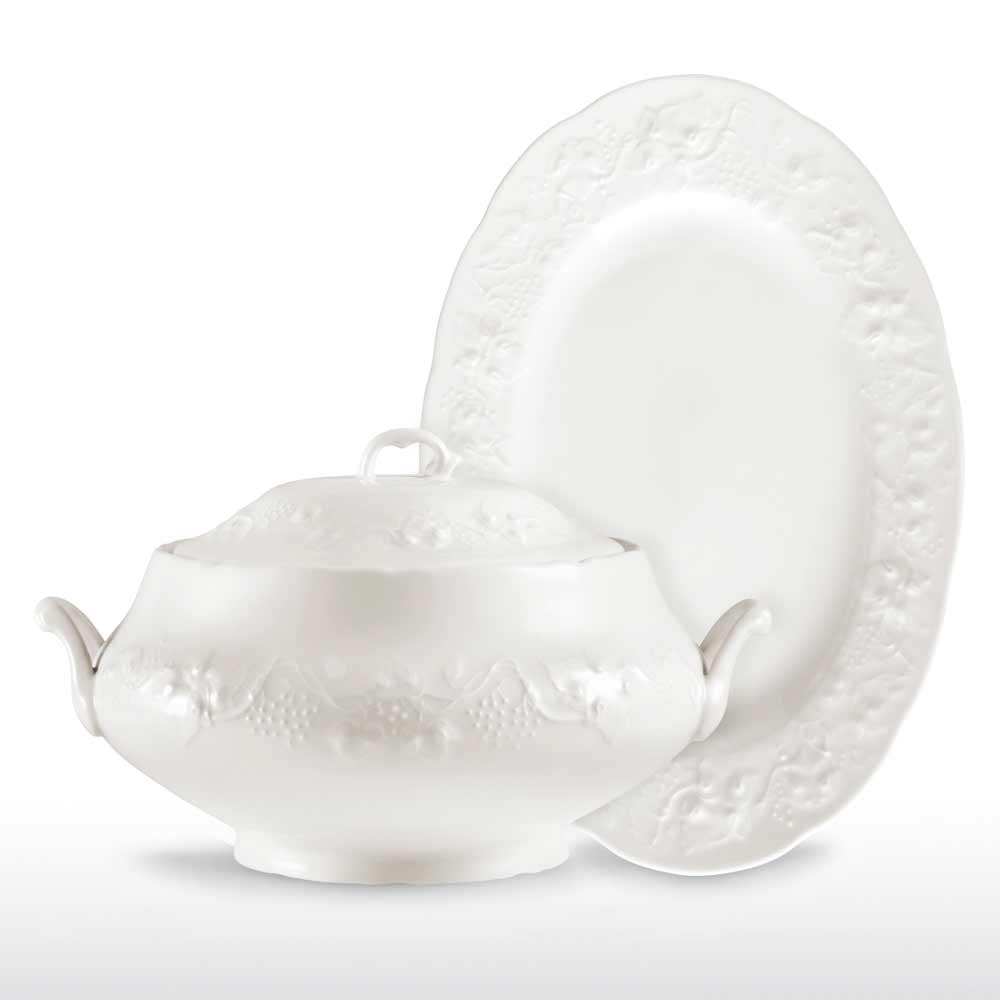 Velká elegantní a rafinovaná polévková mísa a oválný servírovací podnos v bílém porcelánu, 2 kusy.