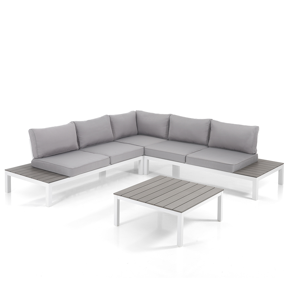 Tato rohová pohovka a zahradní stůl představují kvintesenci elegantní relaxace a současného stylu. Díky svému bílému rámu a čistým liniím nabízí pohovka elegantní, moderní kontrast s teplým dřevem sedací plochy a povrchu stolu a vytváří tak příjemné prostředí, které je příjemné a zároveň esteticky příjemné .