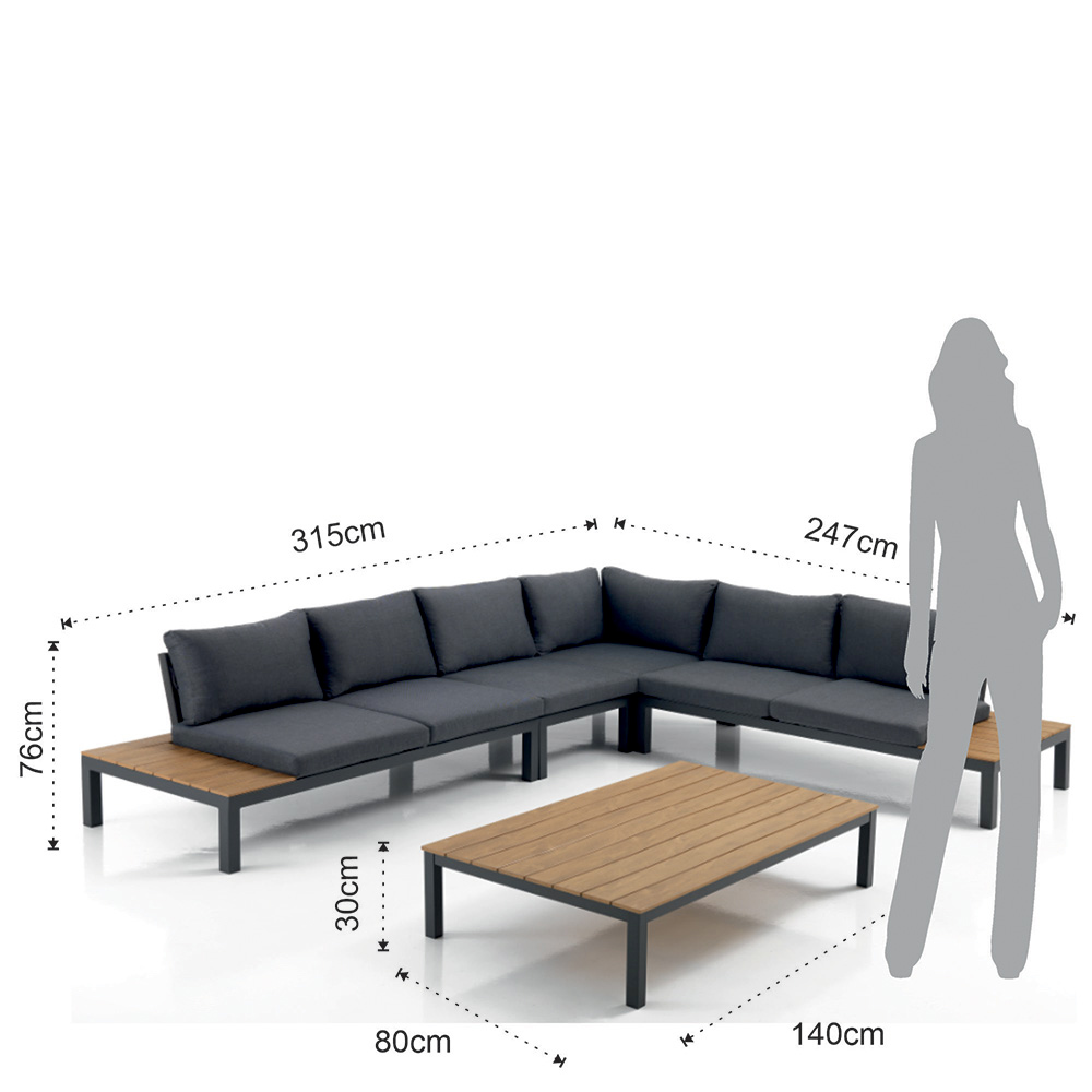 Tato rohová pohovka s konferenčním stolkem na zahradu je ukázkou moderního venkovního luxusu . Kombinace robustních hliníkových konstrukcí a použití polywoodu pro detaily konferenčního stolku a pohovek vytváří elegantní a sofistikovaný vizuální kontrast. Tlusté, pohodlné polštáře poskytují příjemný a uvolňující zážitek ze sezení, ideální pro dlouhá odpočinková odpoledne nebo večery společenského života pod hvězdami.