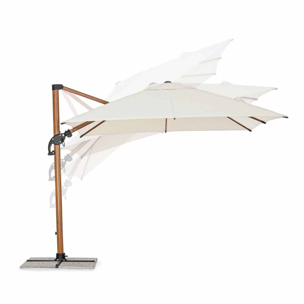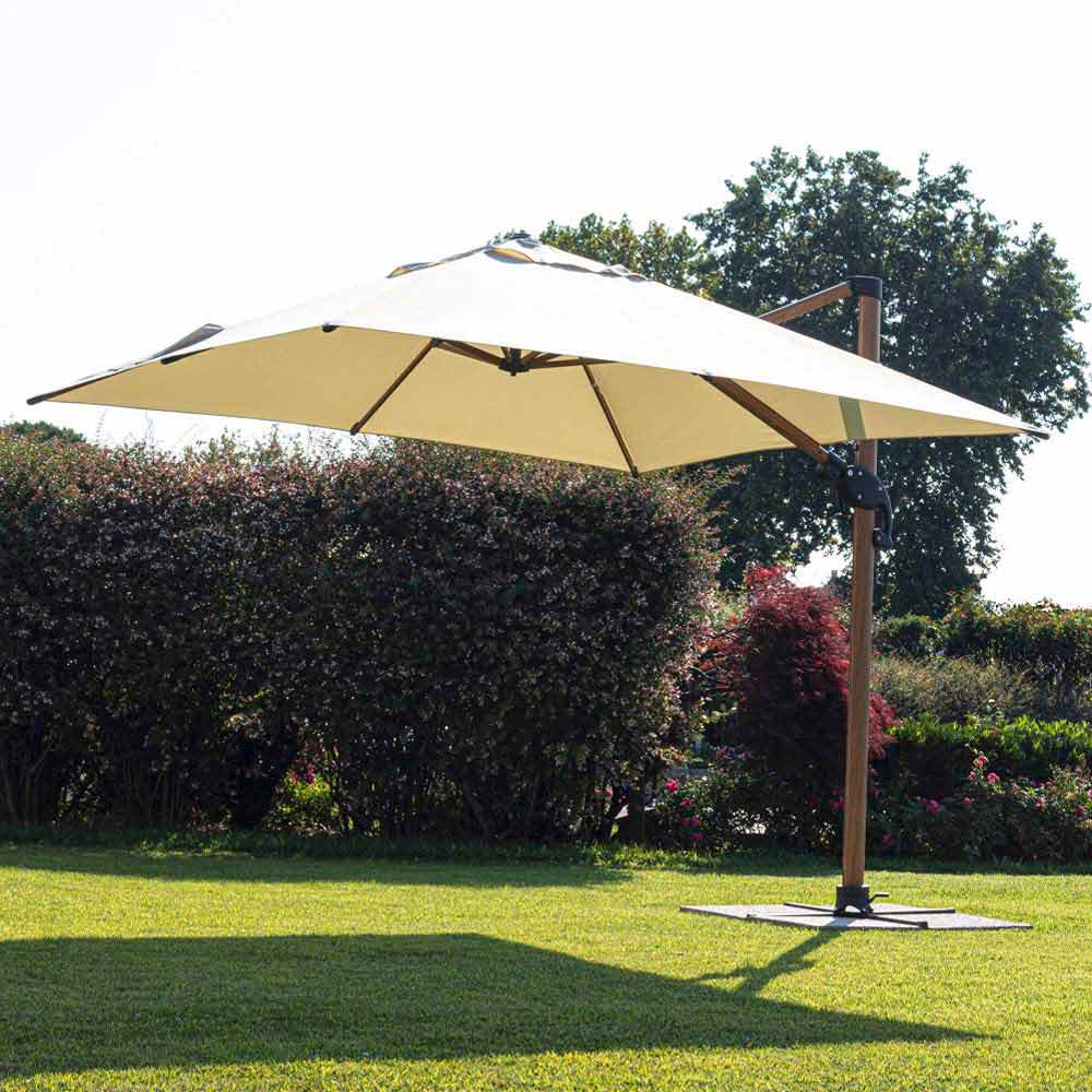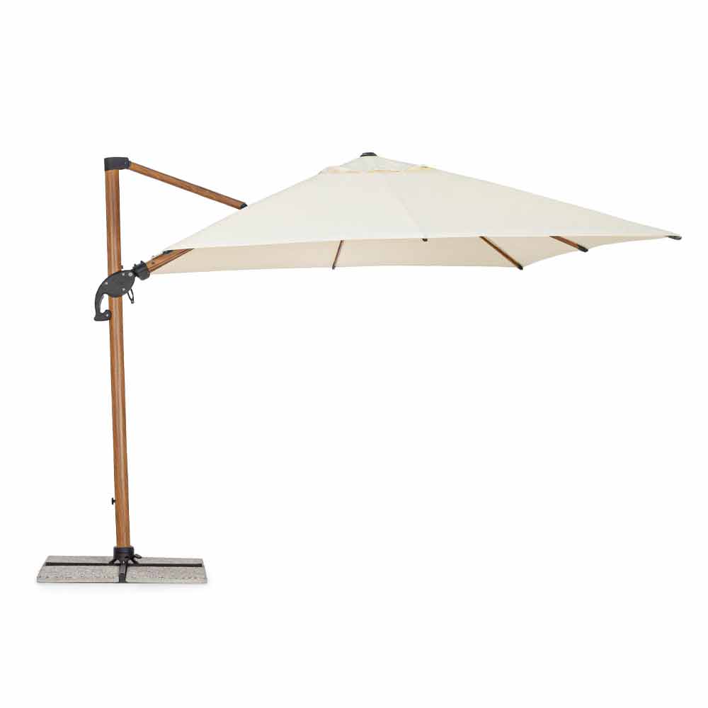 Práškově lakovaná hliníková struktura (polyester) s efektem dřeva. Tyč 90x60mm, 8 žeber 25x17mm. Béžová polyesterová tkanina 250 g / m2 s povlakem pa (polyamid). Křížová základna z oceli . 360 ° otočná tyč s pedálem. Vertikální náklon se 6polohovou rukojetí. Vybaven systémem sklopení pravého a levého deštníku. Včetně potahu na deštník.