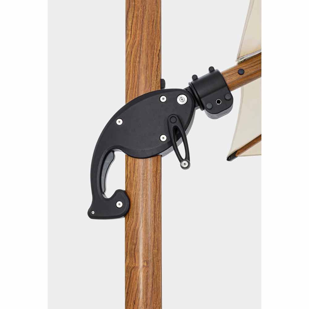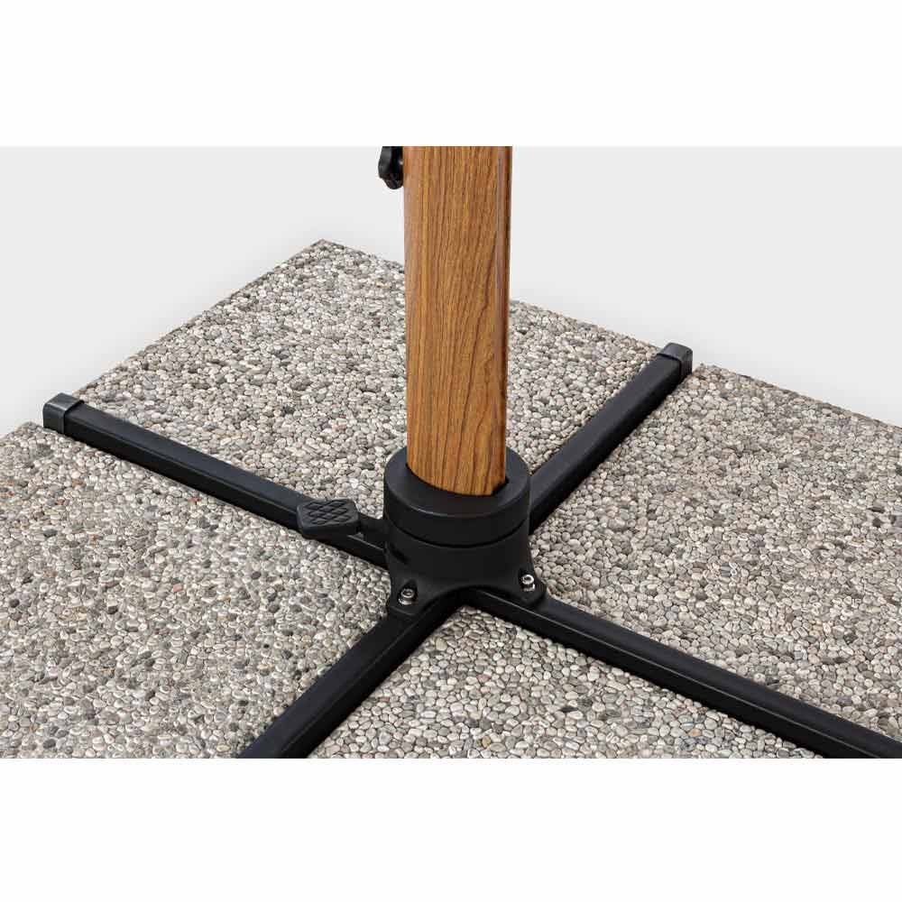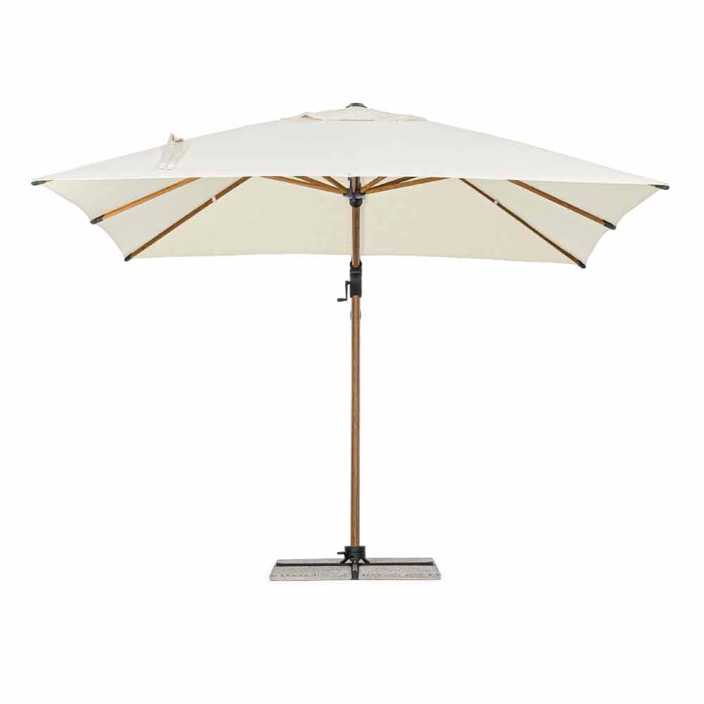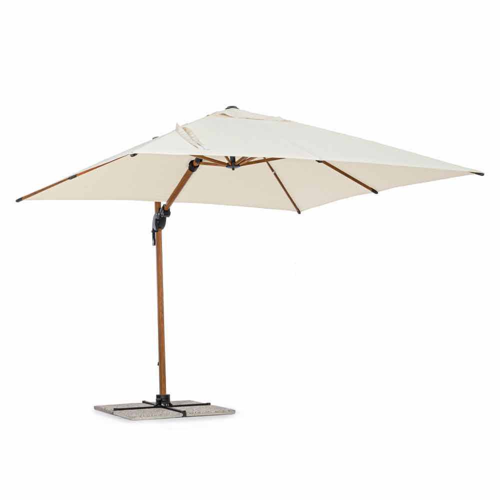 Práškově lakovaná hliníková struktura (polyester) s efektem dřeva. Tyč 90x60mm, 8 žeber 25x17mm. Béžová polyesterová tkanina 250 g / m2 s povlakem pa (polyamid). Křížová základna z oceli . 360 ° otočná tyč s pedálem. Vertikální náklon se 6polohovou rukojetí. Vybaven systémem sklopení pravého a levého deštníku. Včetně potahu na deštník.