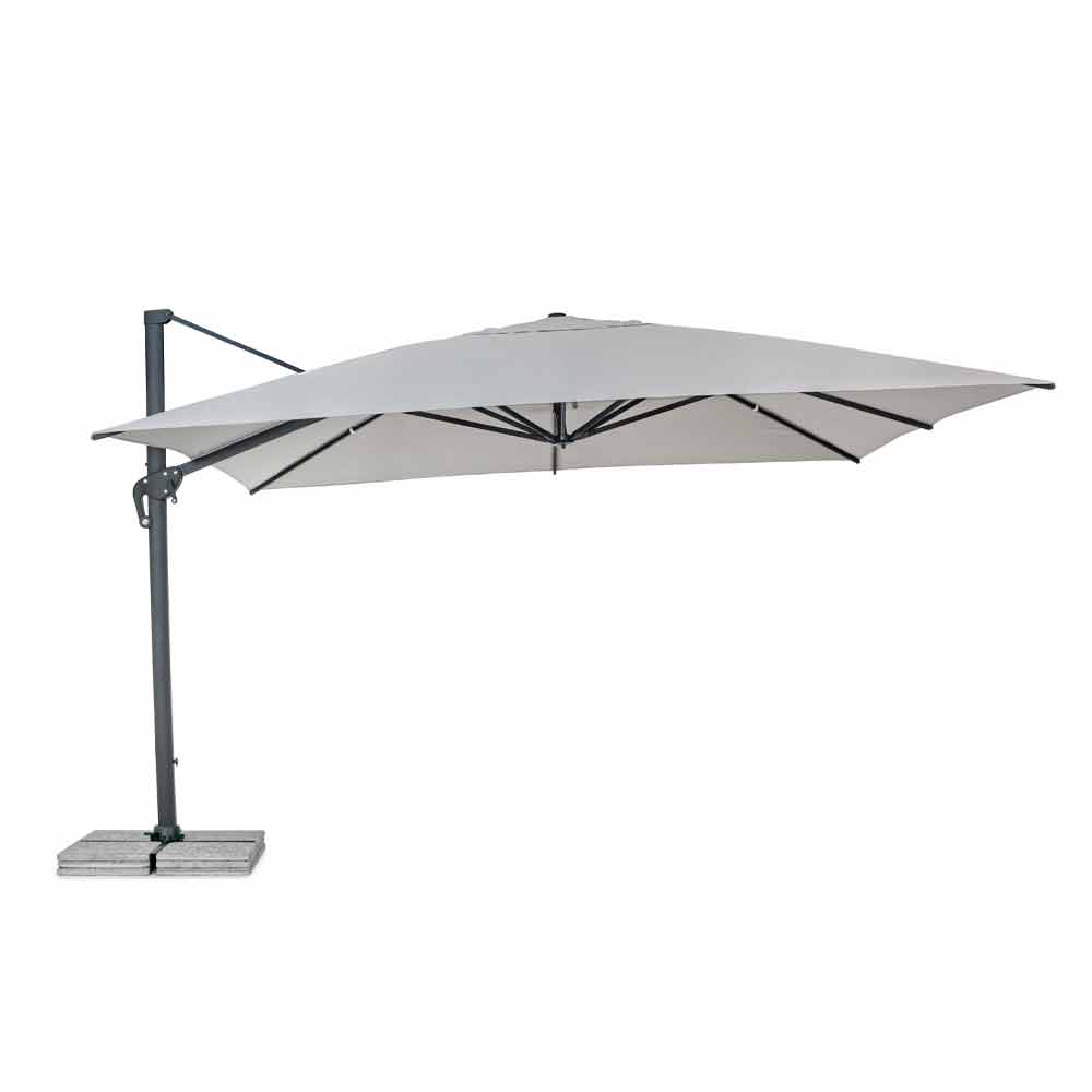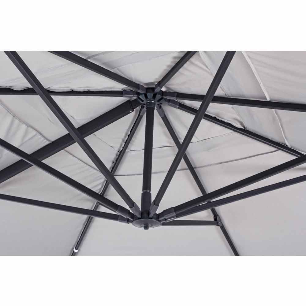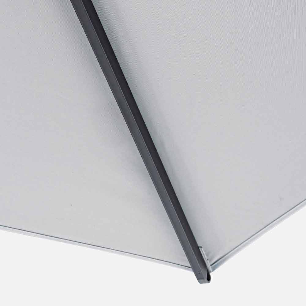 Práškově lakovaná hliníková konstrukce (polyester). 93x57mm tyč. 8 žeber 28x18mm. Světle šedá polyesterová tkanina 250 g / m2 s povlakem pa (polyamid). Křížová základna z oceli . 360 ° otočná tyč s pedálem. Svislý sklon s 5polohovou rukojetí. Včetně potahu na deštník.