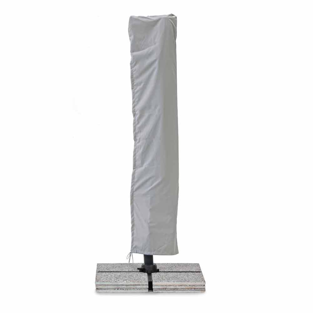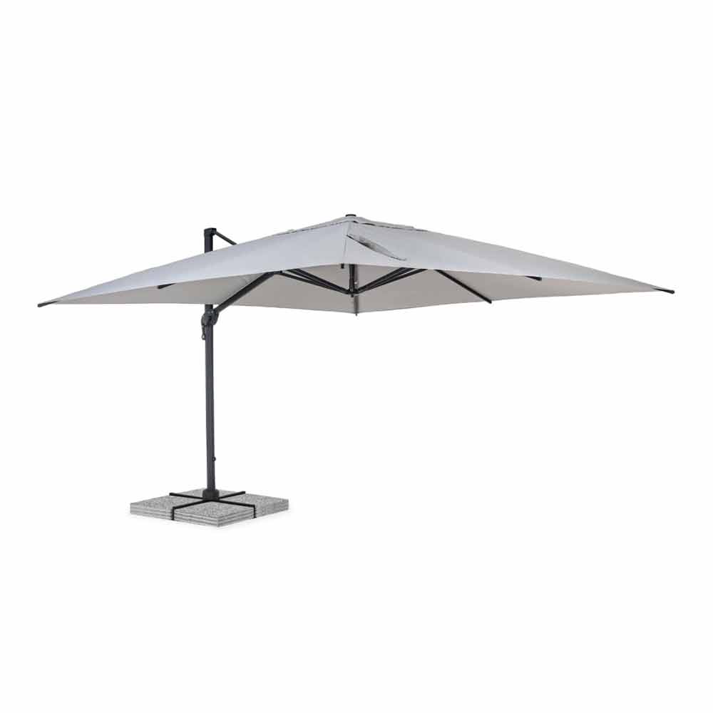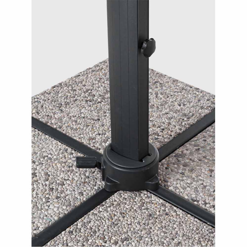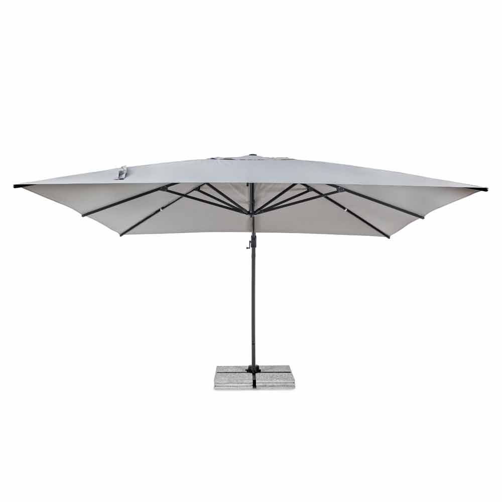 Práškově lakovaná hliníková konstrukce (polyester). 93x57mm tyč. 8 žeber 28x18mm. Světle šedá polyesterová tkanina 250 g / m2 s povlakem pa (polyamid). Křížová základna z oceli . 360 ° otočná tyč s pedálem. Svislý sklon s 5polohovou rukojetí. Včetně potahu na deštník.