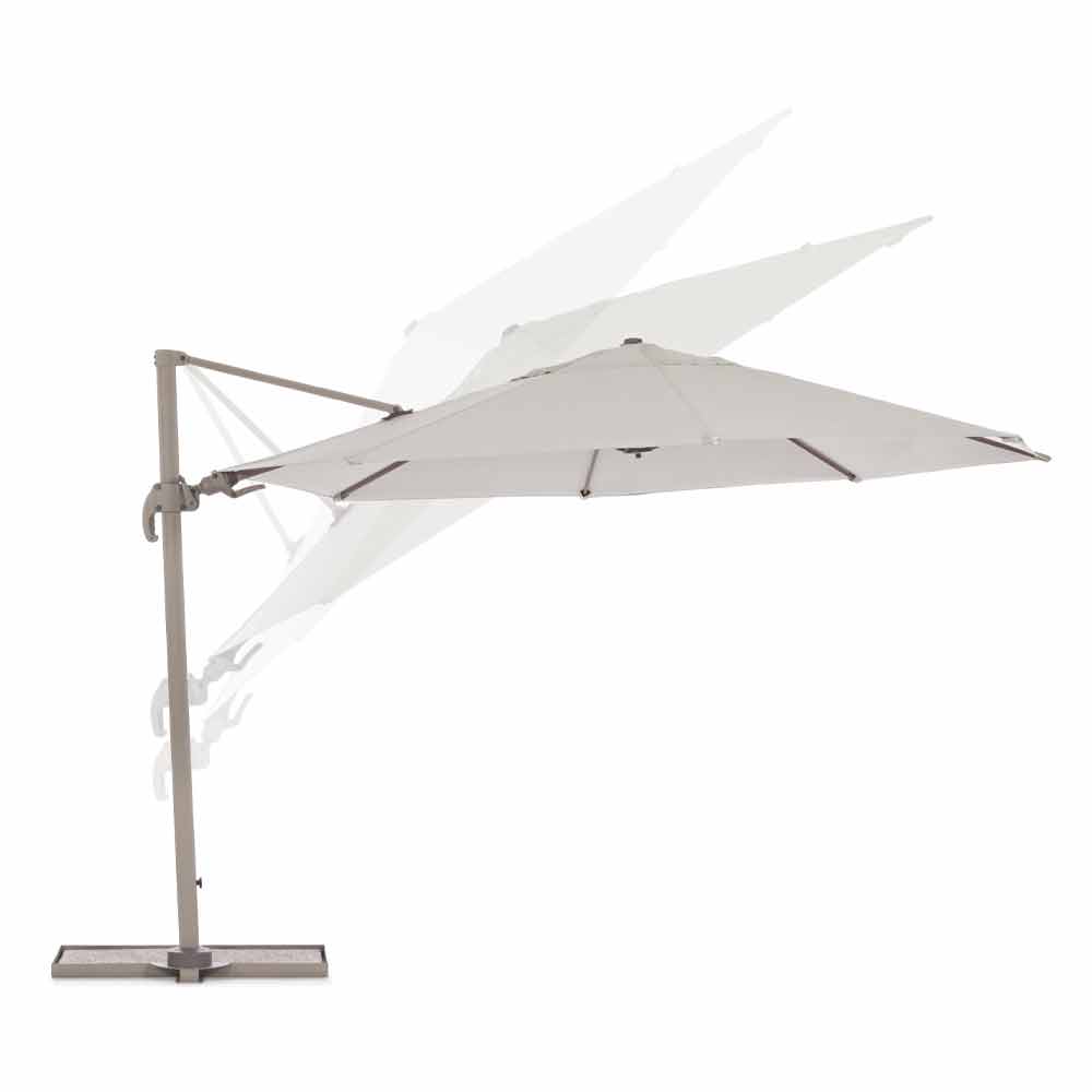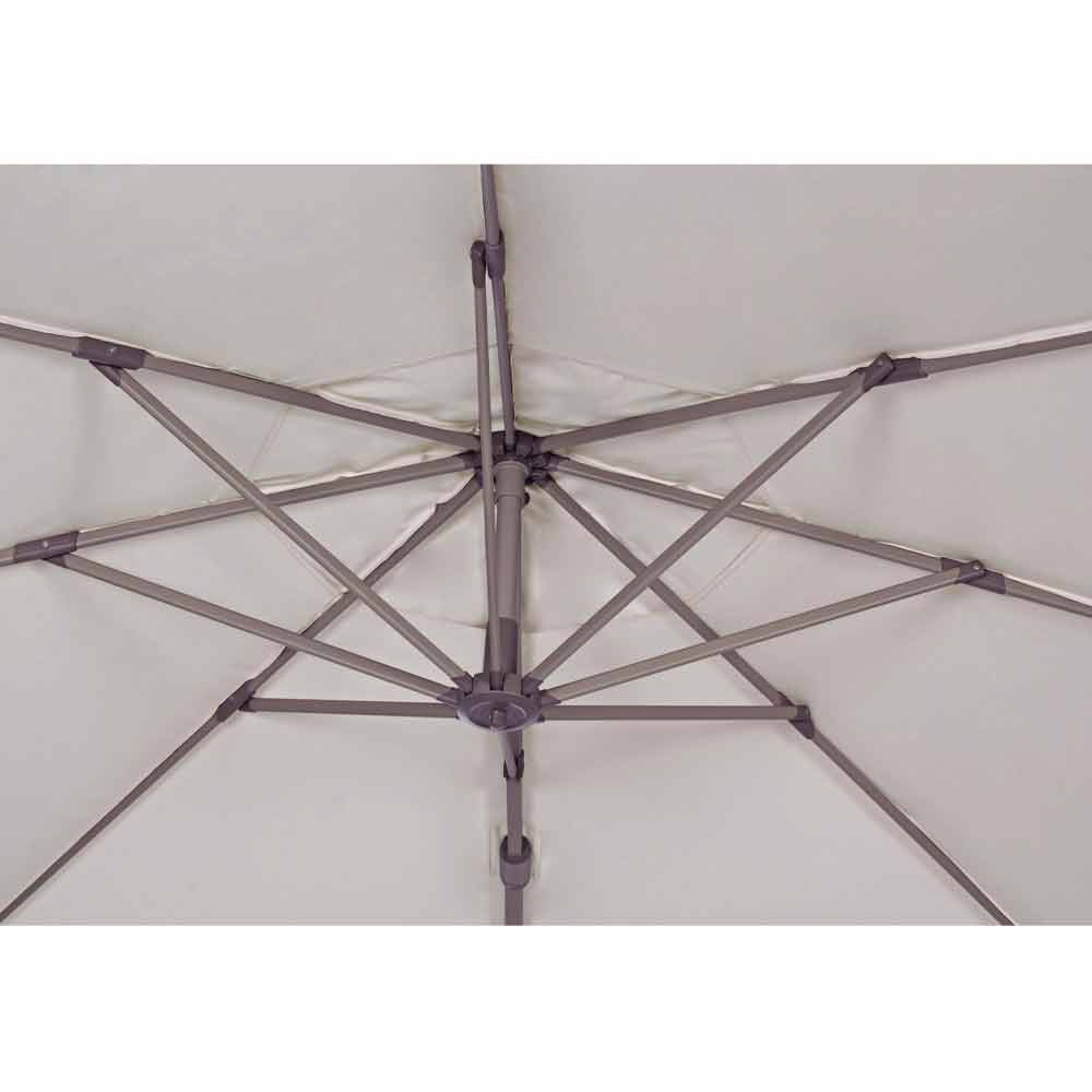 Práškově lakovaná hliníková konstrukce (polyester). Pól 50x78x1,6mm. 8 žeber 12x23x1,0 mm. Písková polyesterová tkanina 200 g / m2 s povlakem pa (polyamid). Boční podstavec z oceli . 360 ° otočná tyč s pedálem. Svislý sklon s 5polohovou rukojetí. Vybaveno rukojetí pro sklopení deštníku zprava doleva.