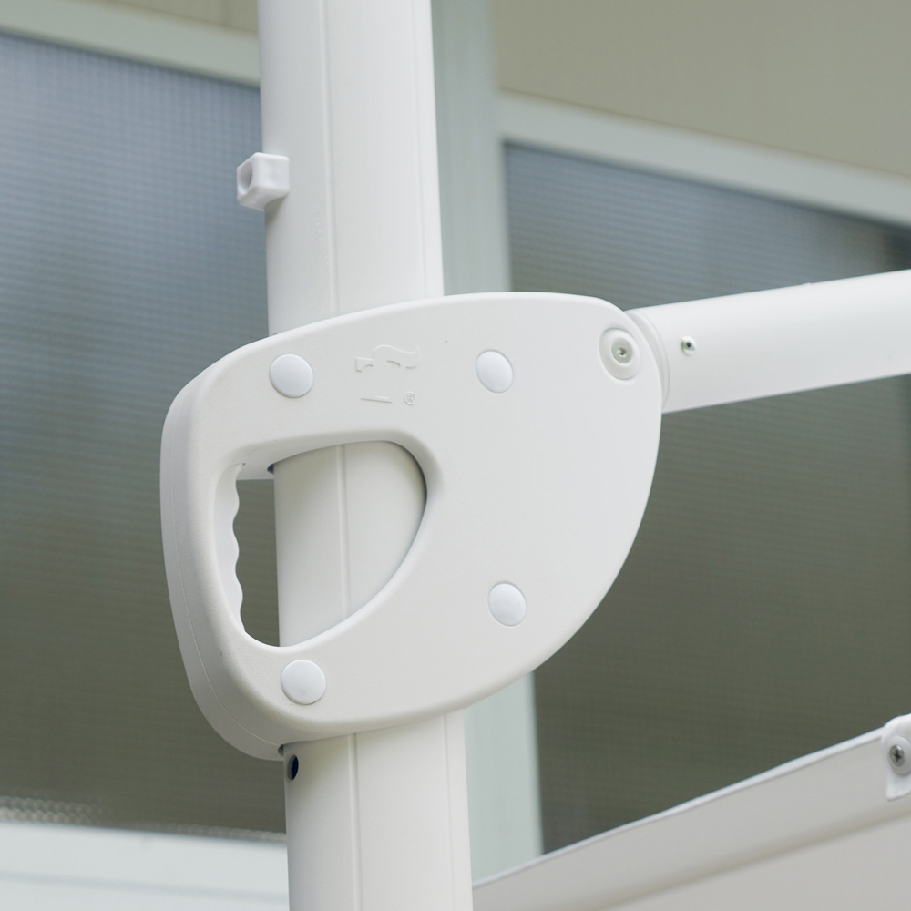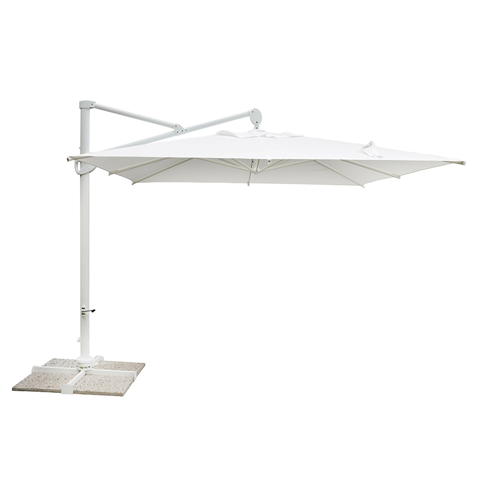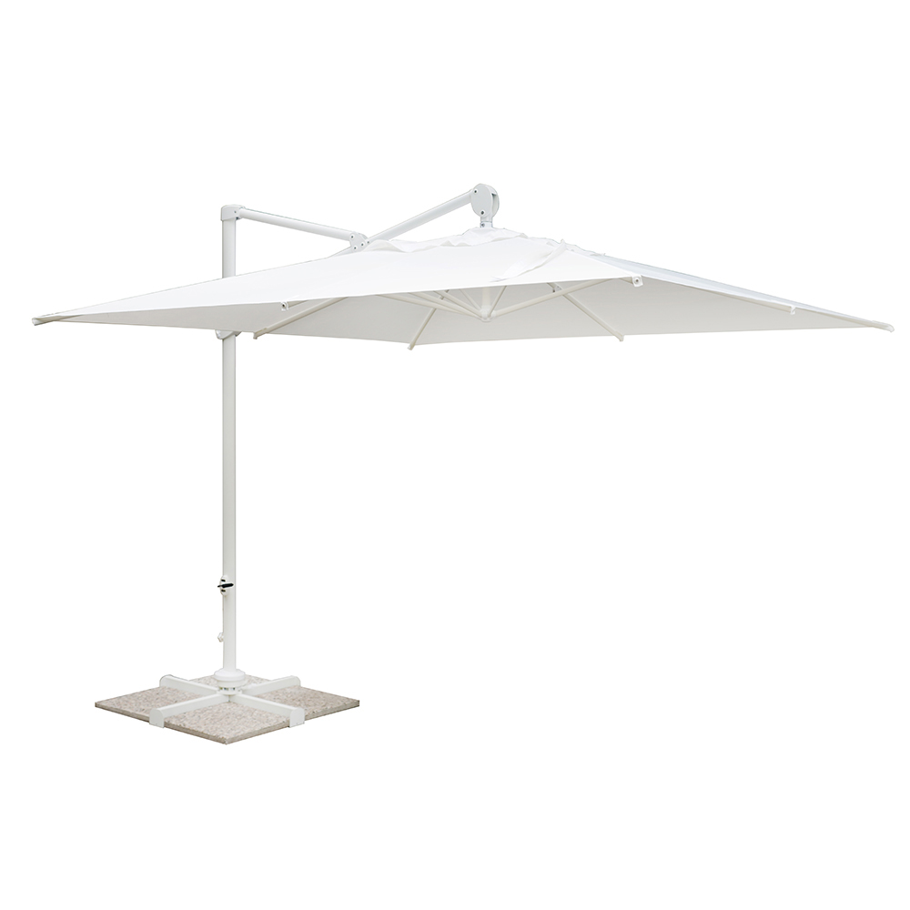 Čtvercový venkovní deštník s bílou hliníkovou konstrukcí.