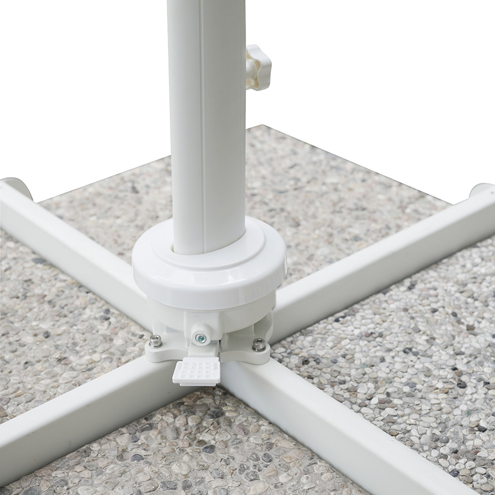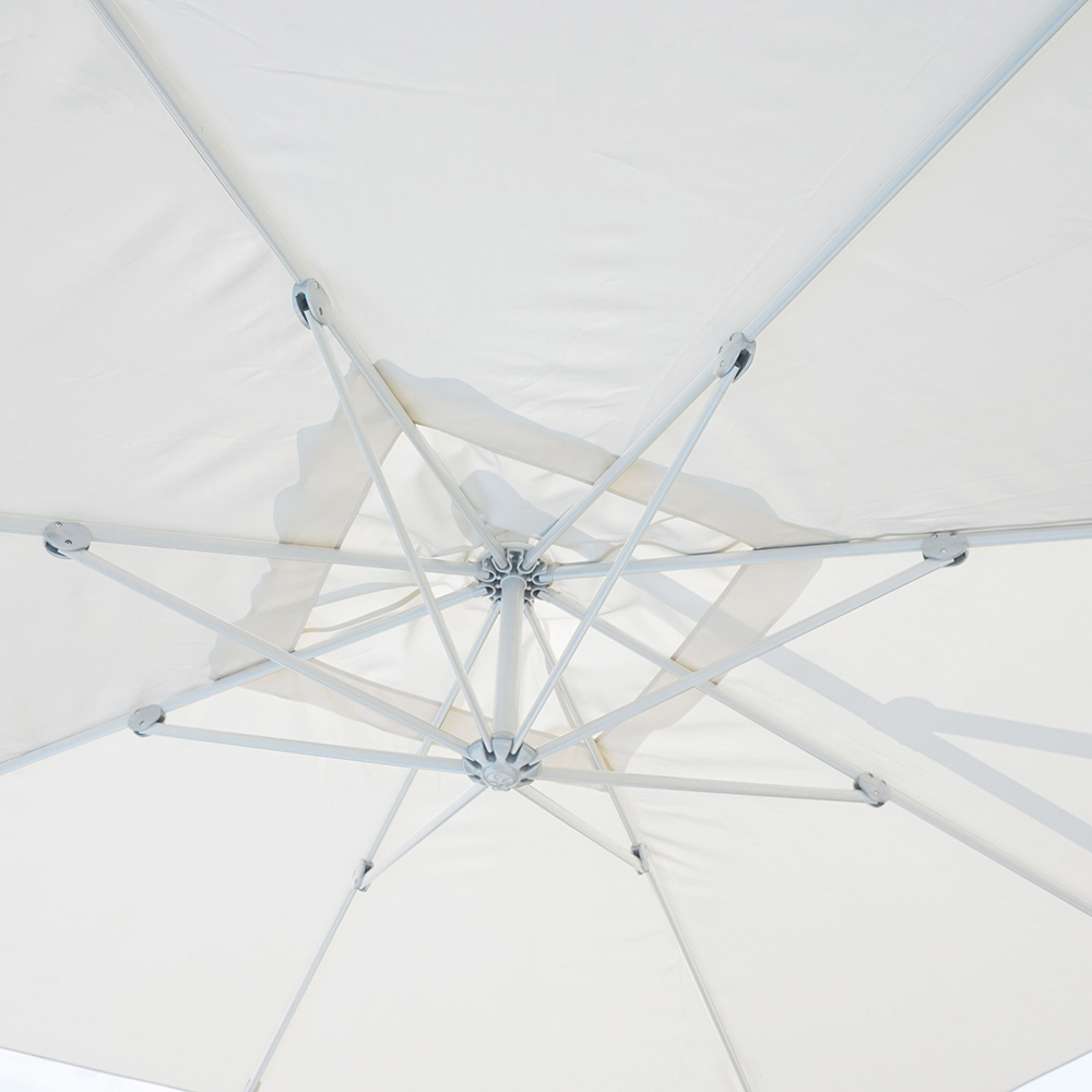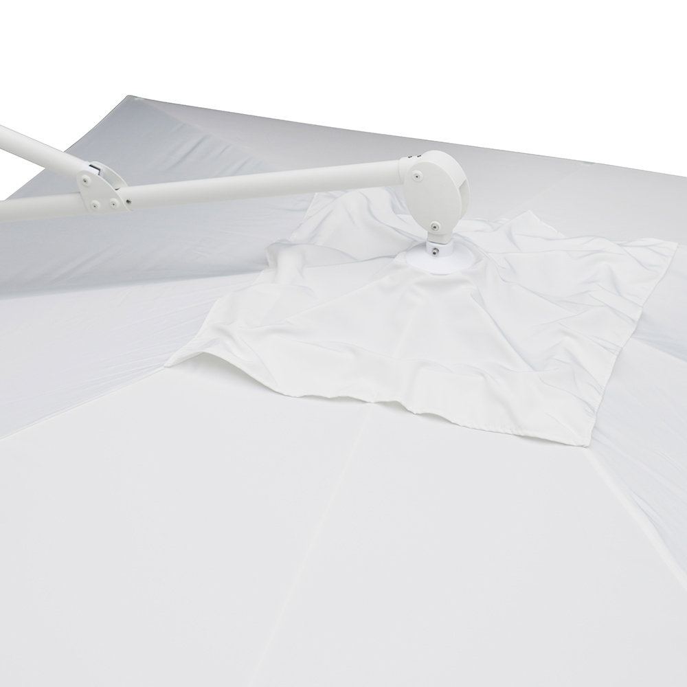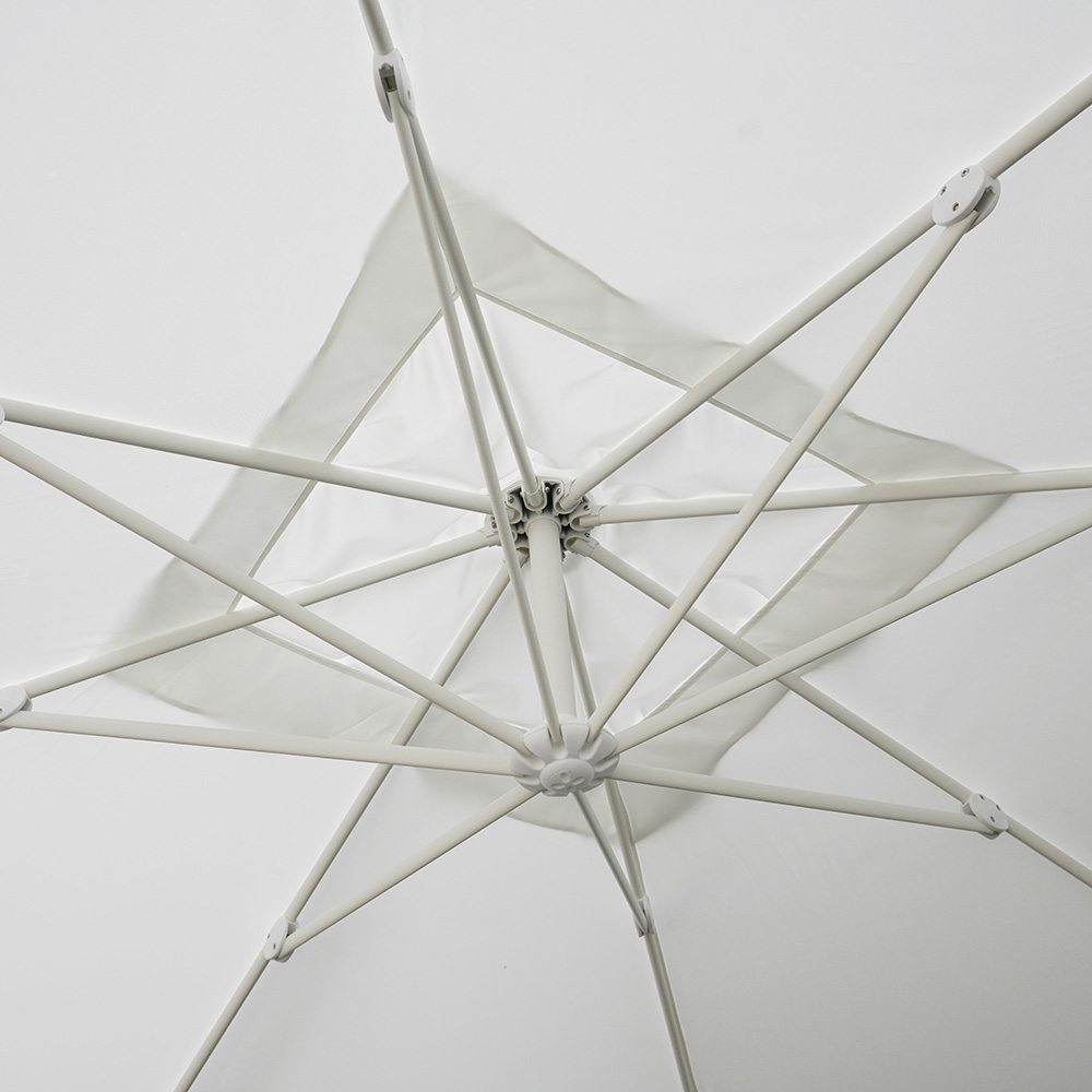 Zahradní deštník s tkaninou z 300g bílého polyesteru s vysokou UV ochranou , otočný až o 360° s větruodolnou kompletní s 8 tyčemi (16x28 mm) a hliníkovou konstrukcí s křížovou základnou v maximální výšce se základnou 2,80 metru, kompletní s rukojetí a pláštěm.