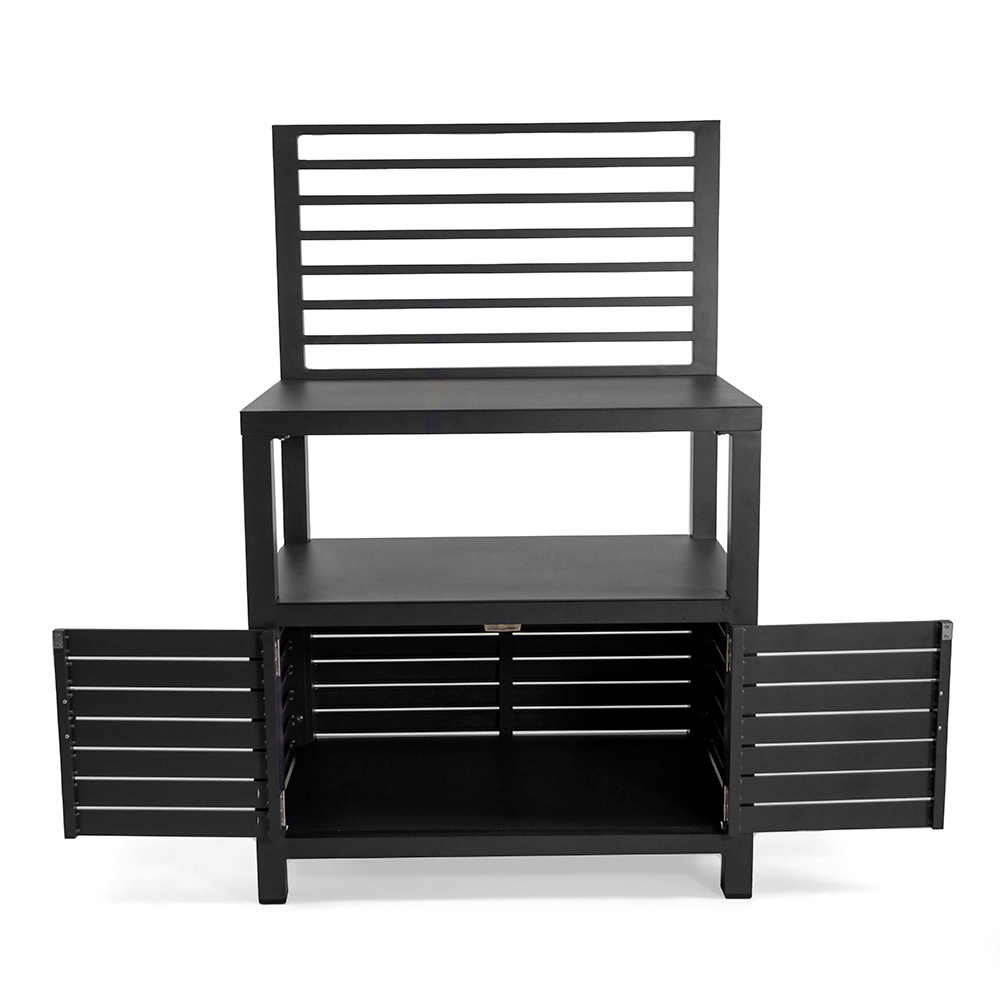 Její robustní hliníkový rám zajišťuje odolnost proti povětrnostním vlivům a dlouhou životnost, zatímco lamelový design dodává skříni nádech sofistikovanosti. Tento příborník je nejen praktickým doplňkem, ale také dekorativním kouskem, který zvýší eleganci vašeho venkovního obytného prostoru.