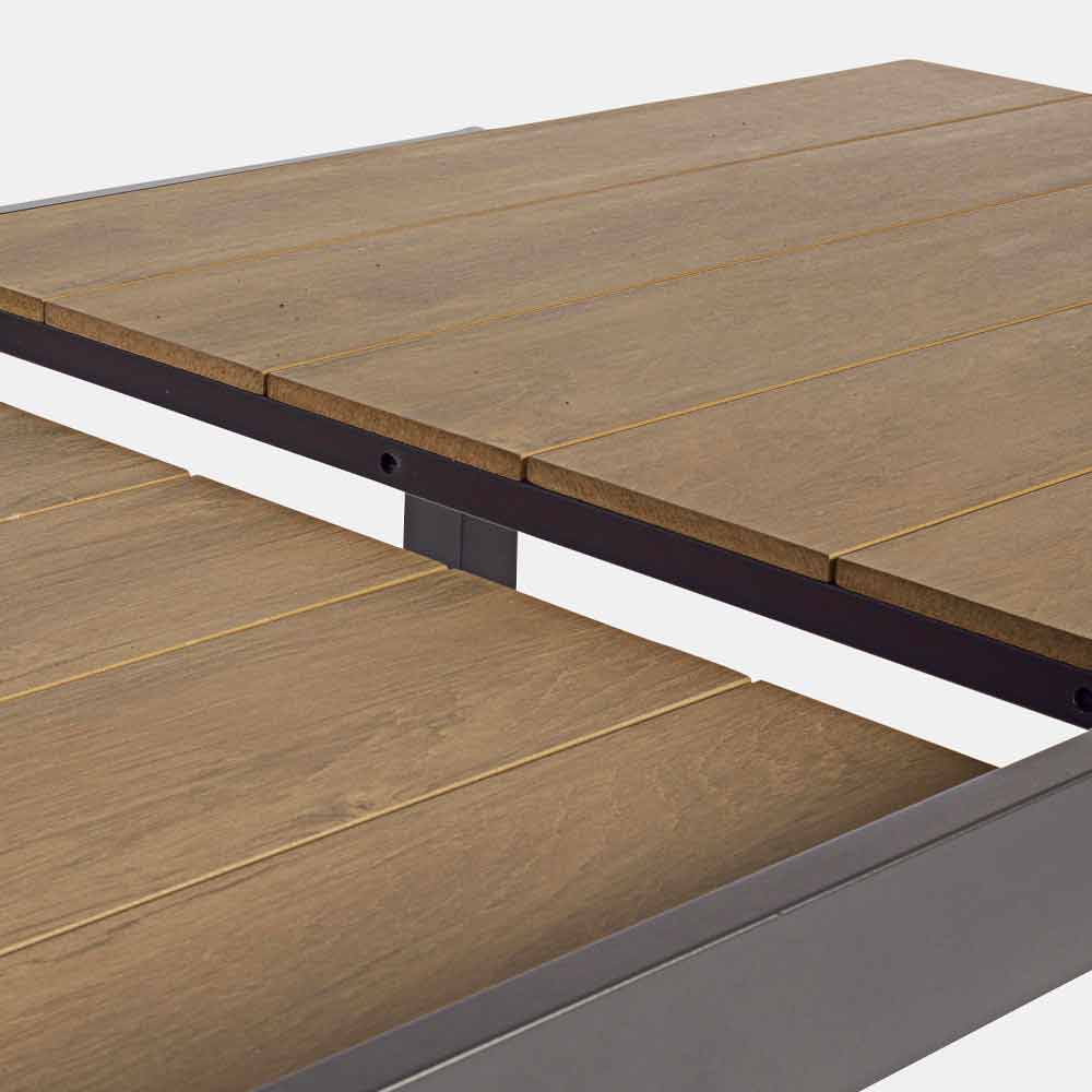 polywoodu (kompozitní materiál s podobným vzhledem jako dřevo) 90% polystyren 10% sbs teaková barva. Výsuvný nástavec. Šrouby z pozinkované oceli.