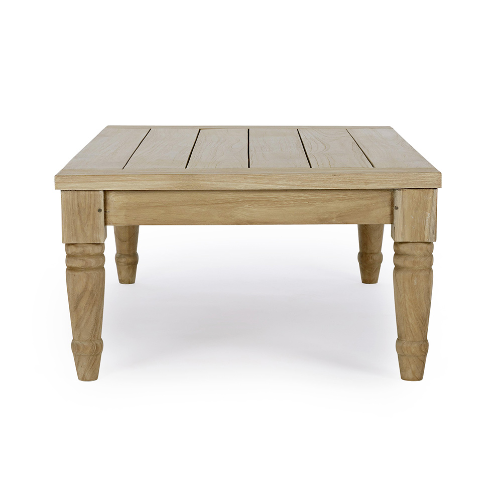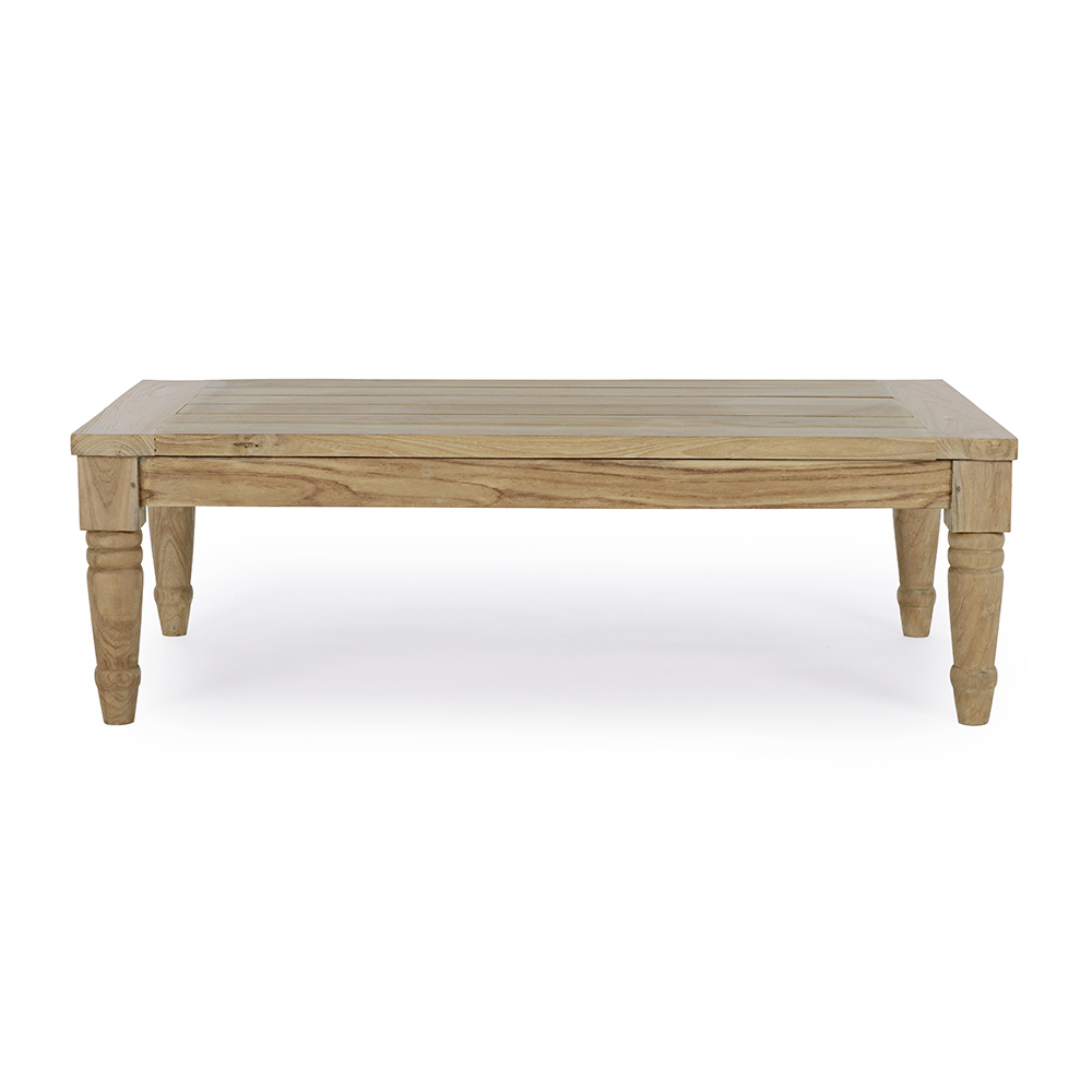 Obdélníkový venkovní konferenční stolek z teakového dřeva s rustikálním povrchem.